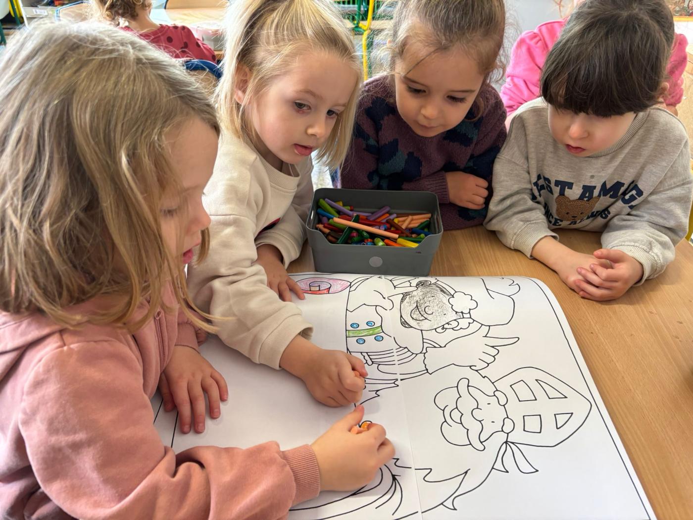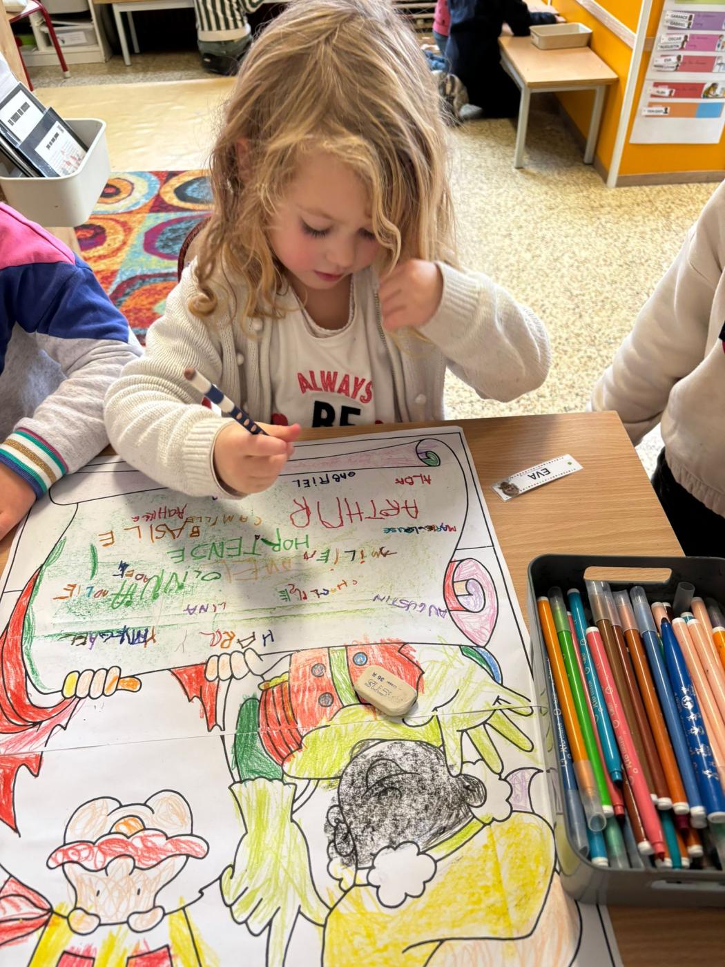 Après avoir parlé de la fête du Roi Philippe et dégusté de bonnes frites, les enfants ont écrit une lettre que nous avons envoyée au Roi, accompagnée d’une peinture collective du Palais Royal pour lui souhaiter une joyeuse fête.