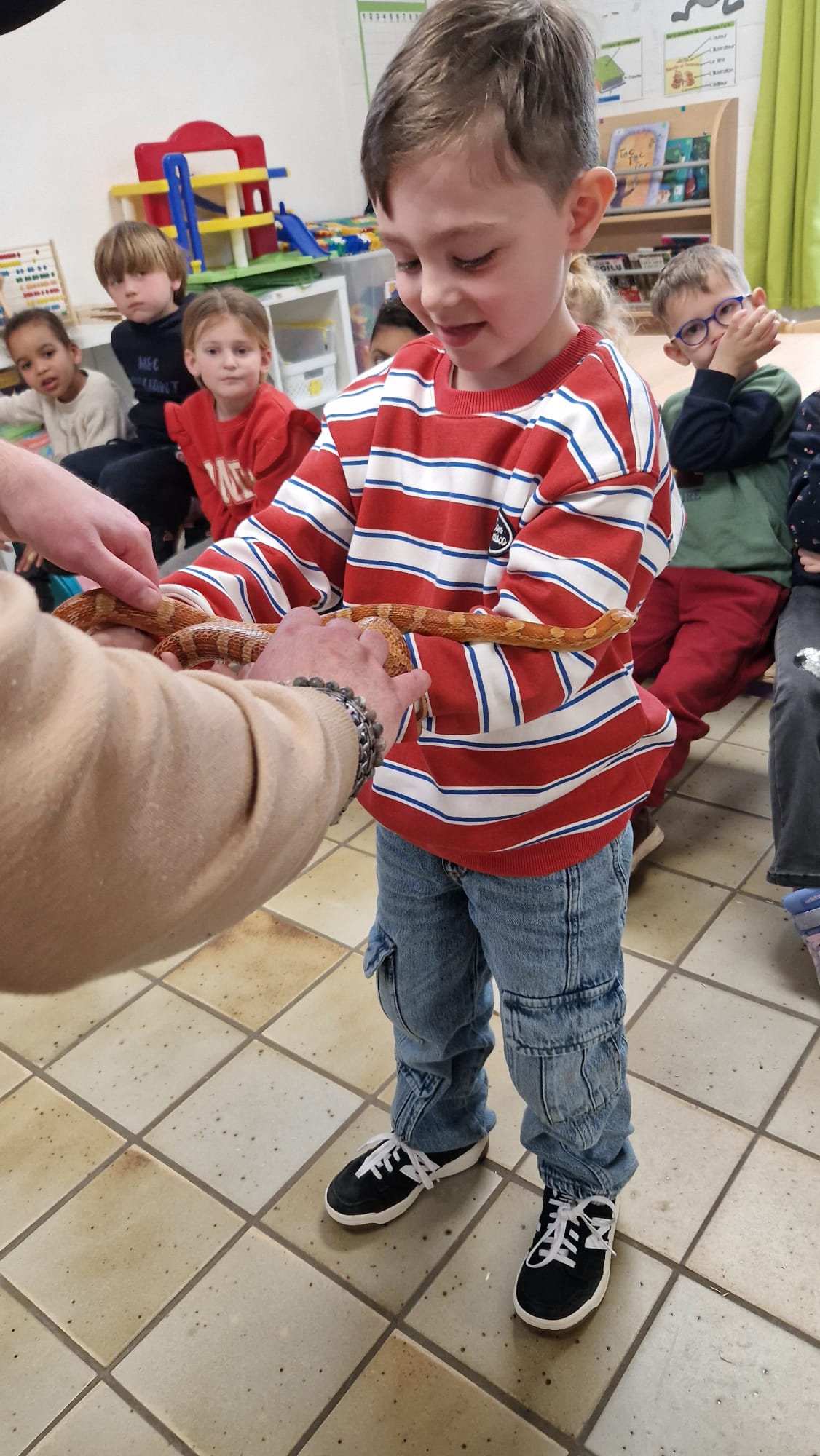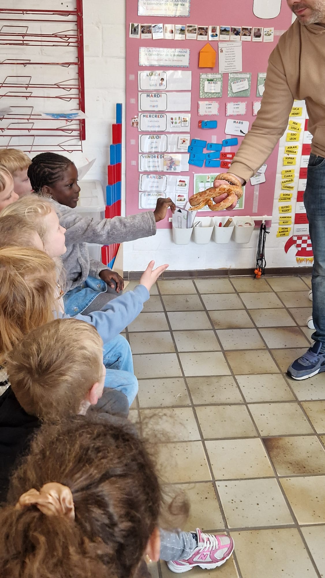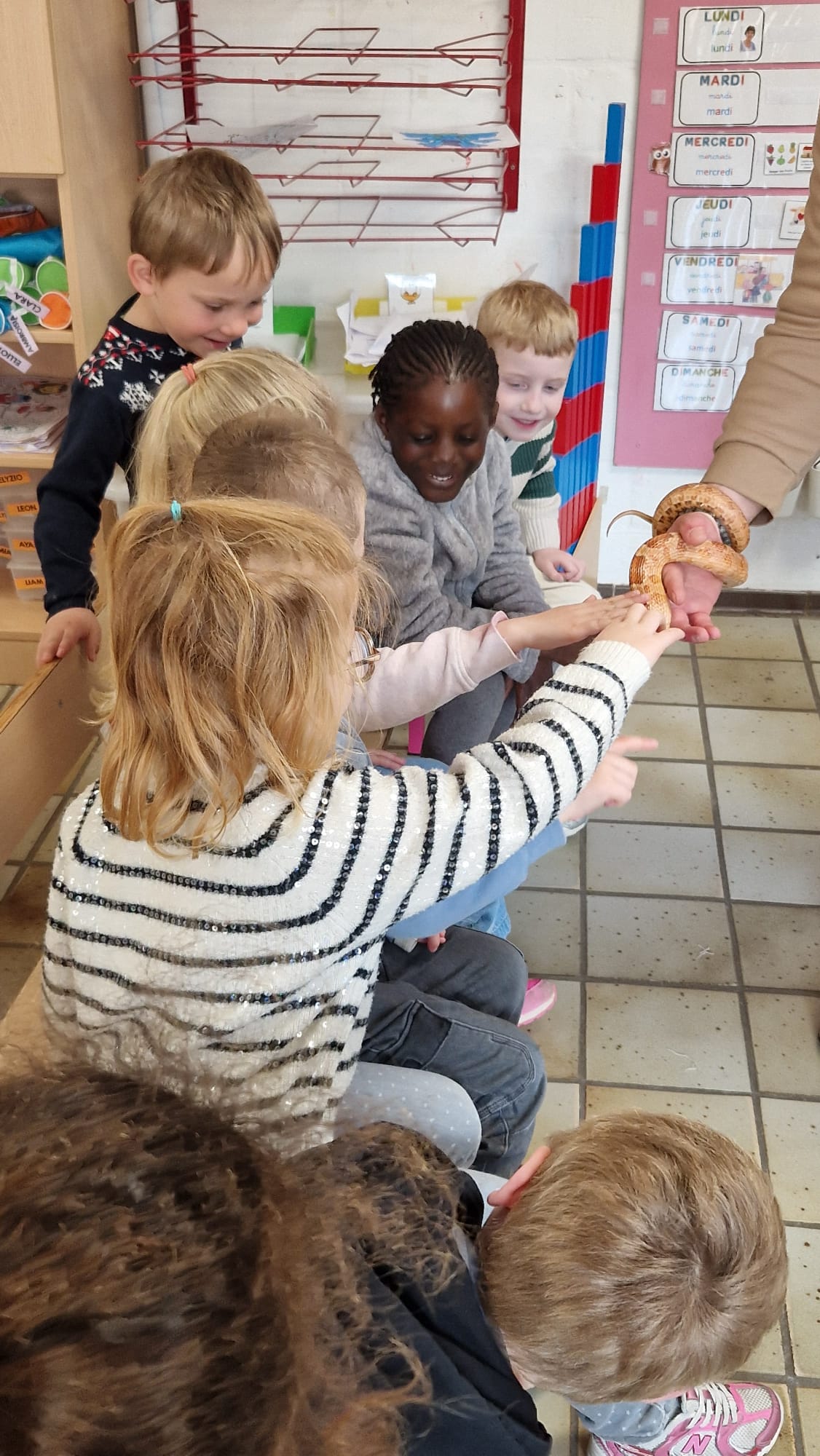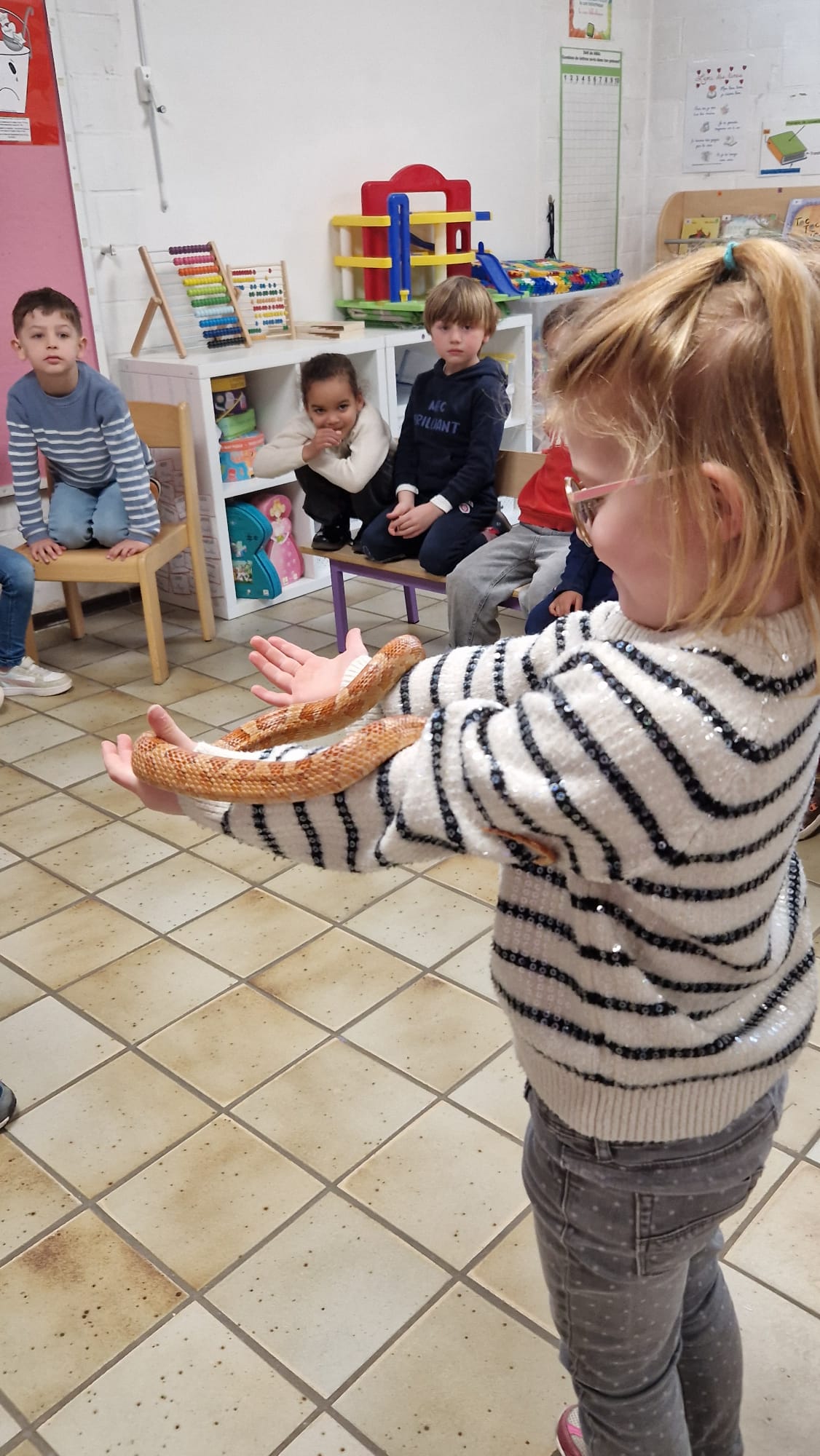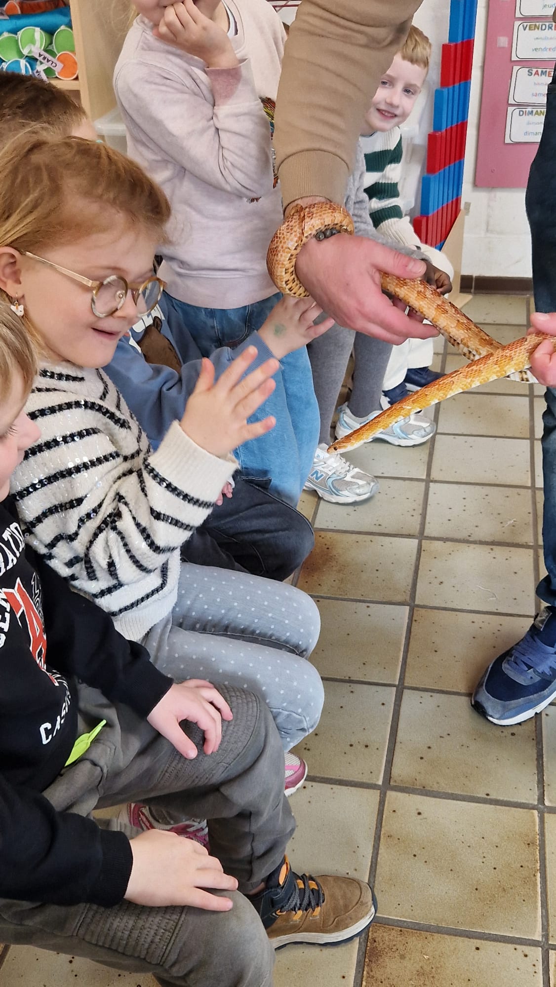 Ce mercredi 25 mars, nous avons reçu la visite de Ginou, le serpent de Kerissa. Son papa Damien nous a permis de découvrir cet animal extraordinaire et surtout de surmonter la peur des enfants. Les plus téméraires ont même pu le porter et le toucher. Quelle belle découverte en éveil scientifique