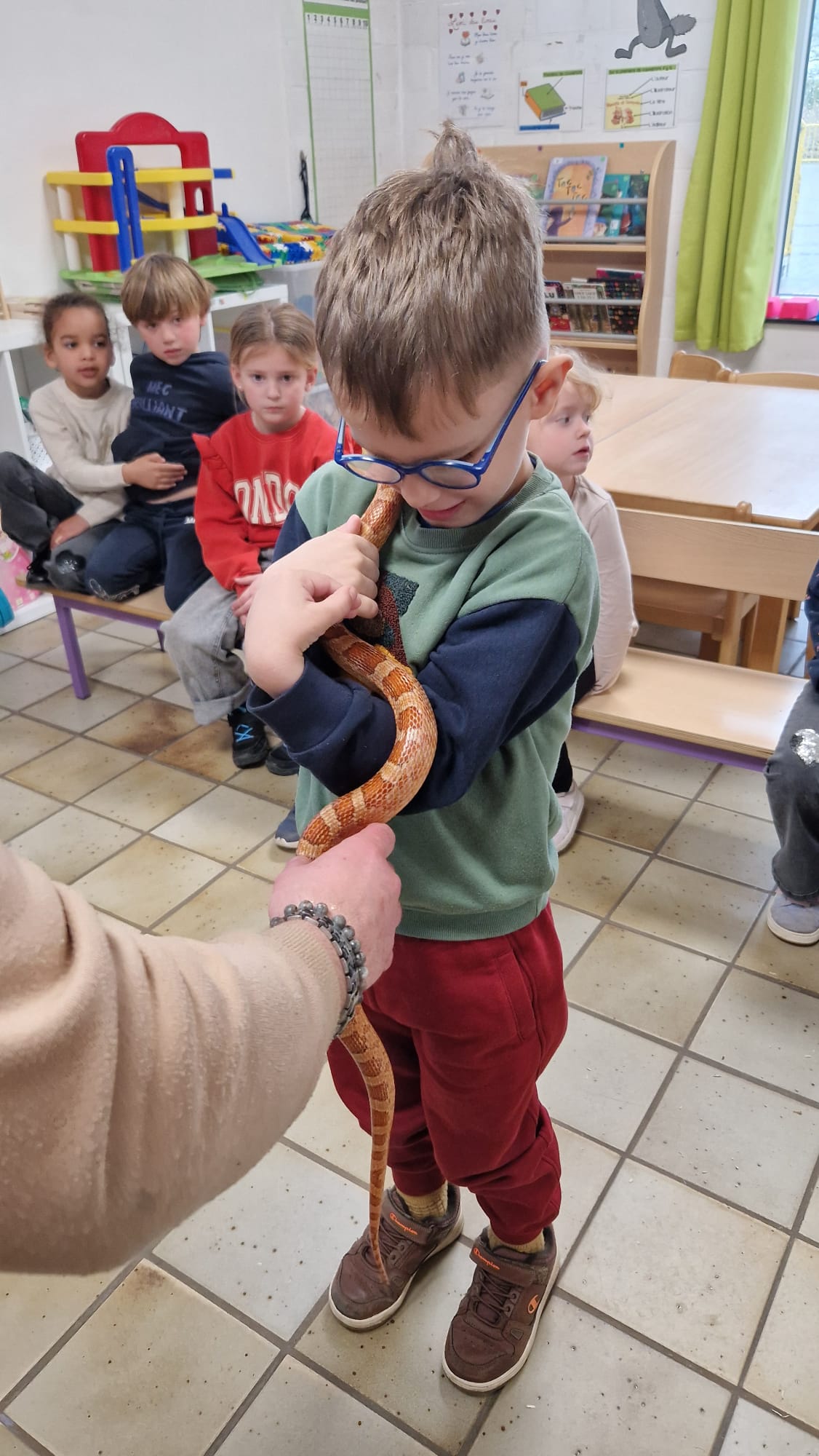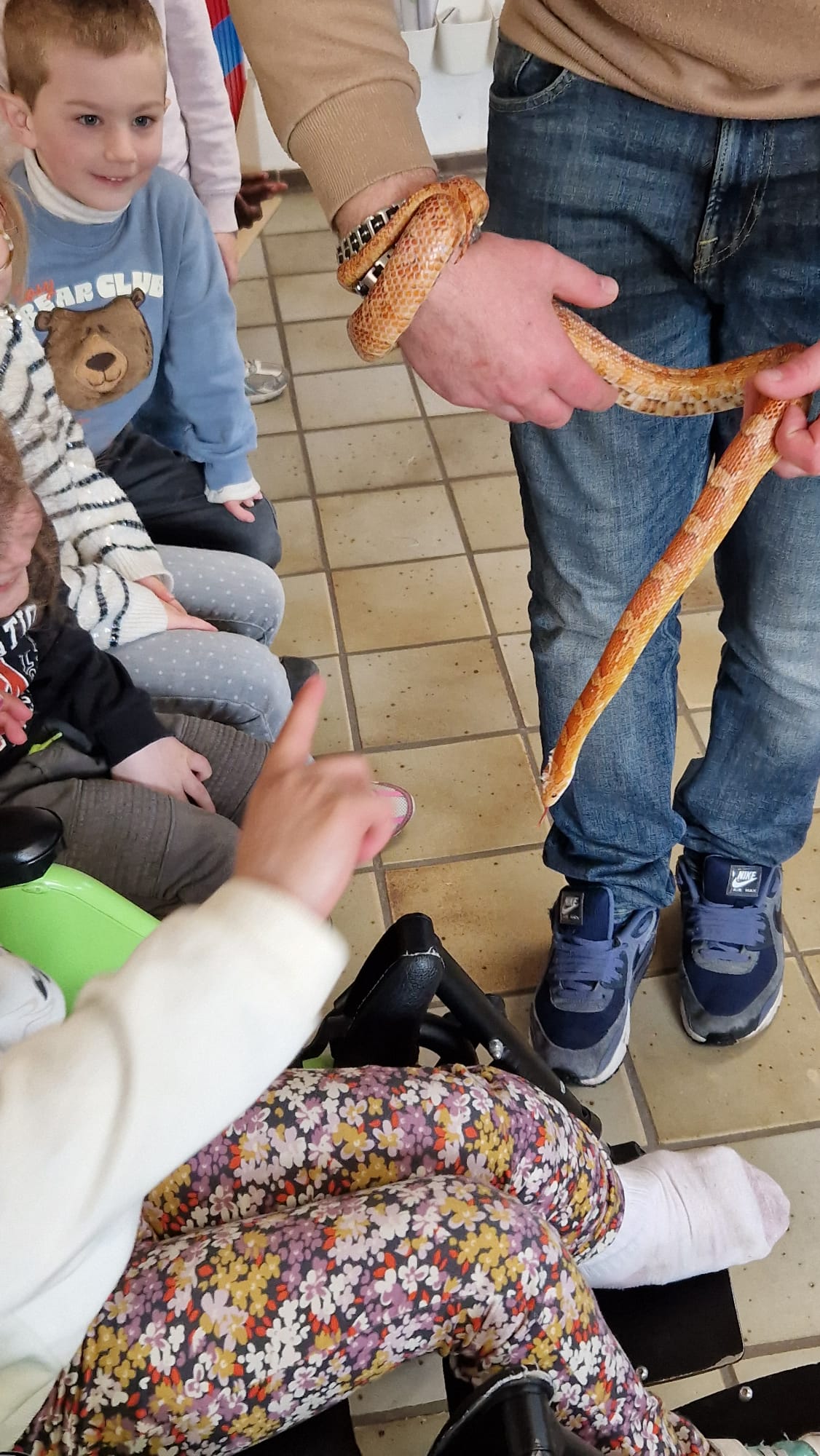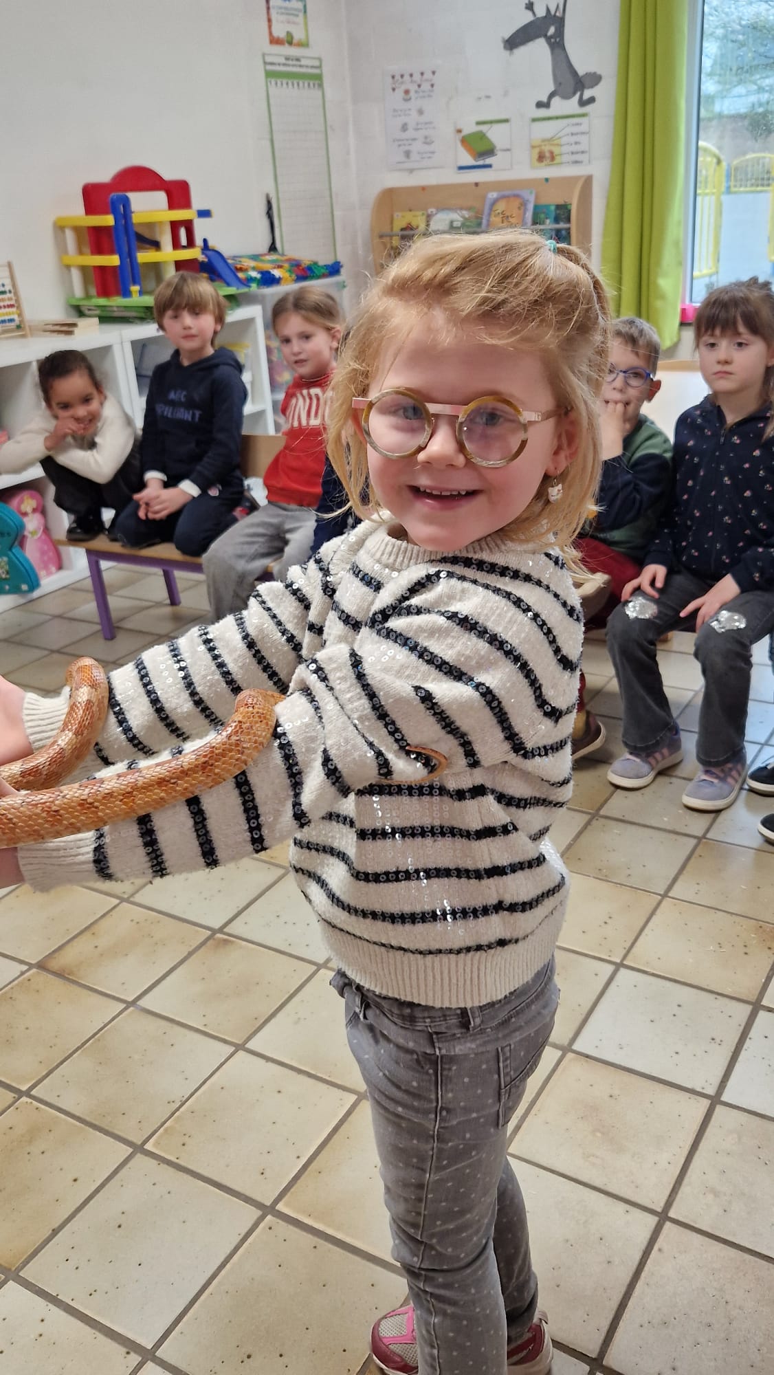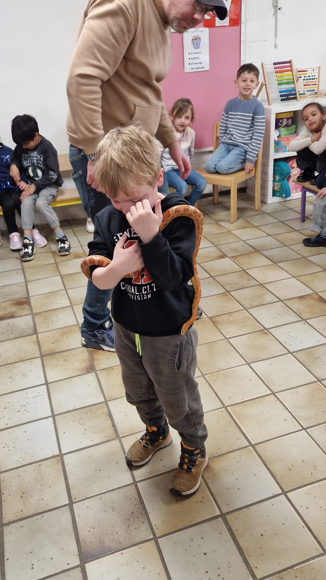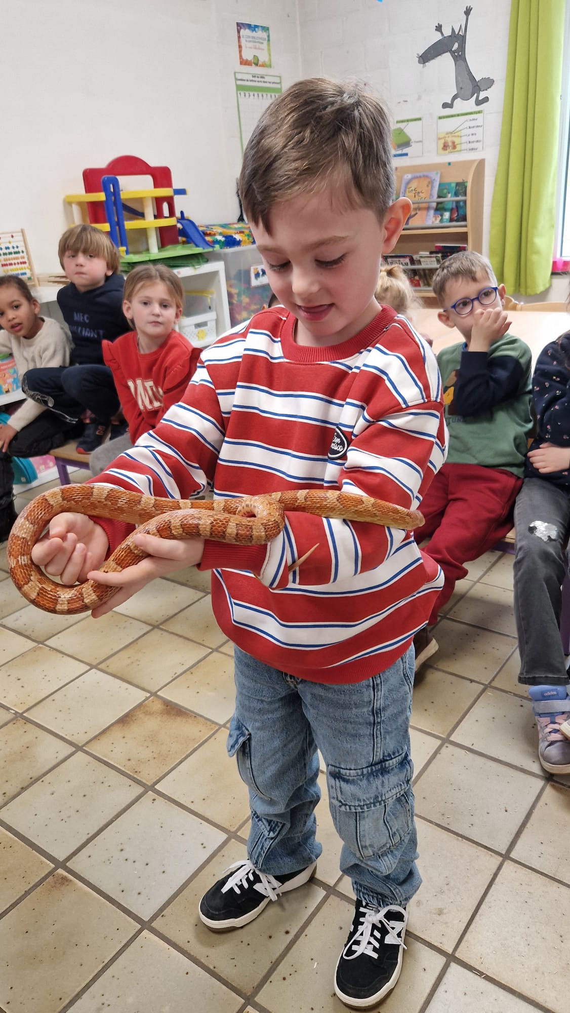 Ce mercredi 25 mars, nous avons reçu la visite de Ginou, le serpent de Kerissa. Son papa Damien nous a permis de découvrir cet animal extraordinaire et surtout de surmonter la peur des enfants. Les plus téméraires ont même pu le porter et le toucher. Quelle belle découverte en éveil scientifique