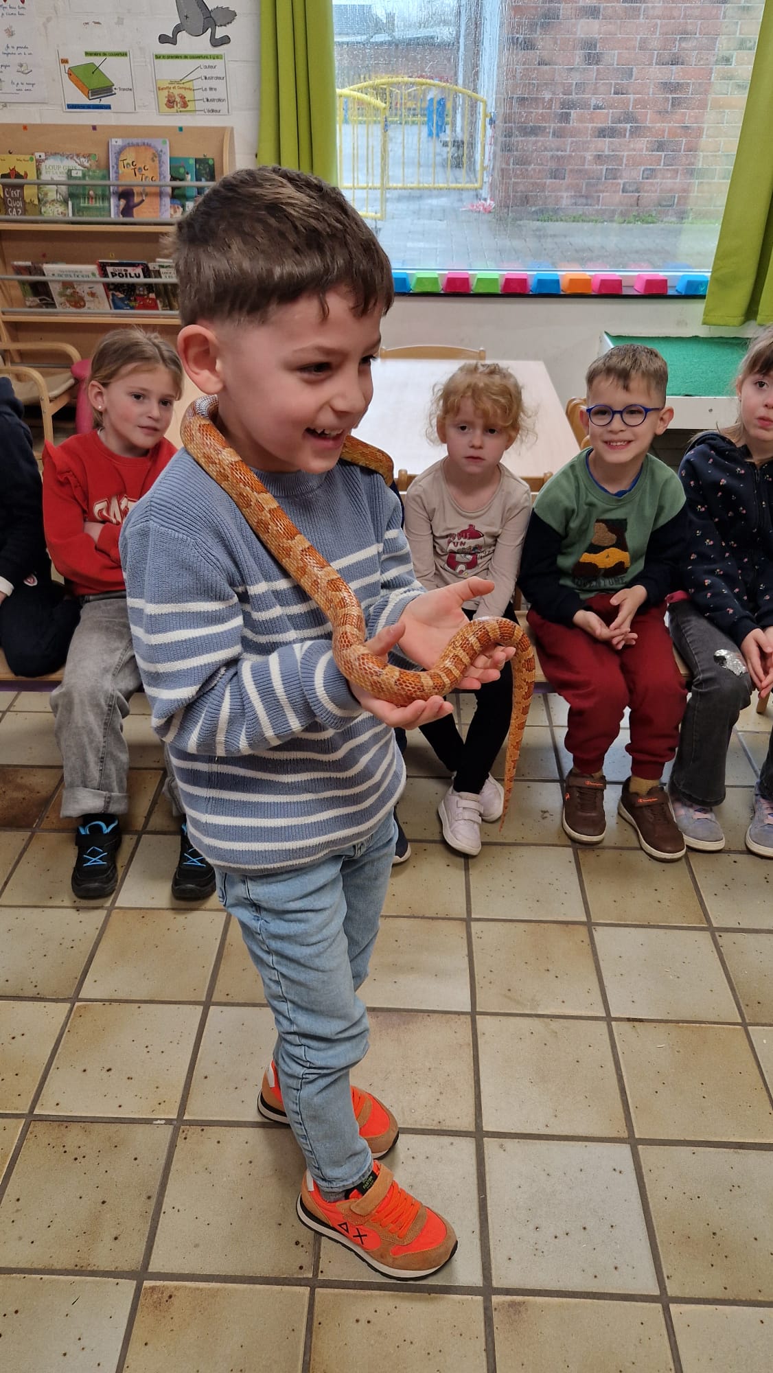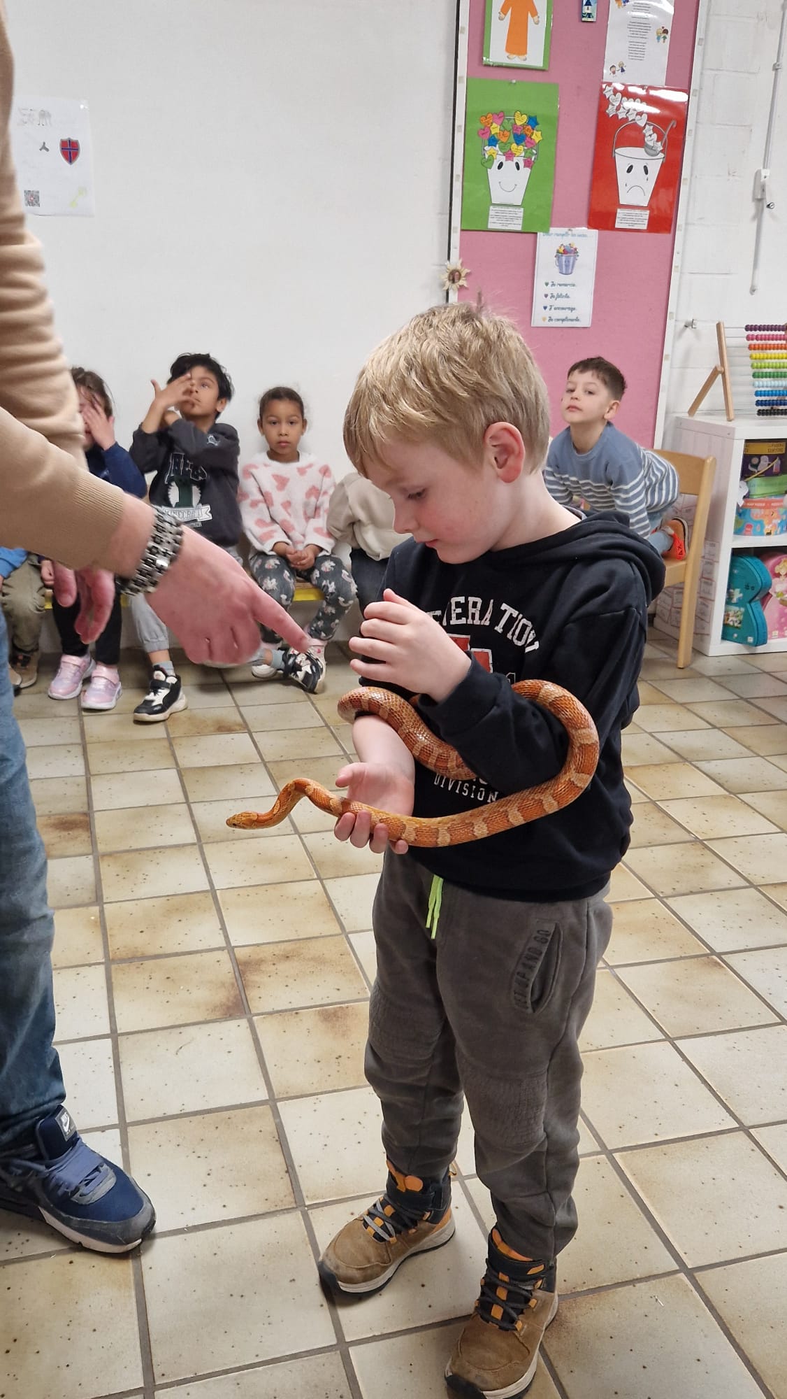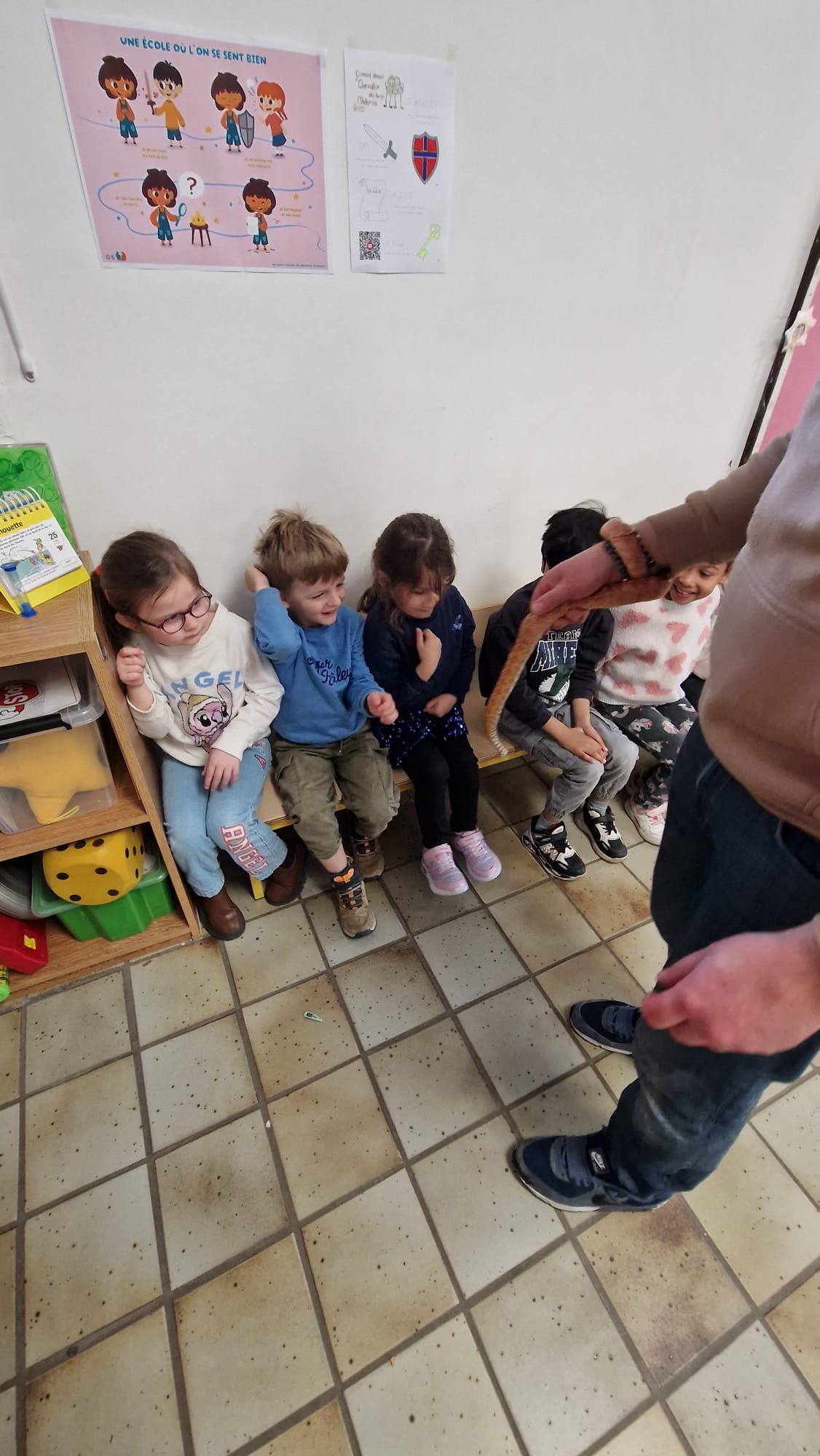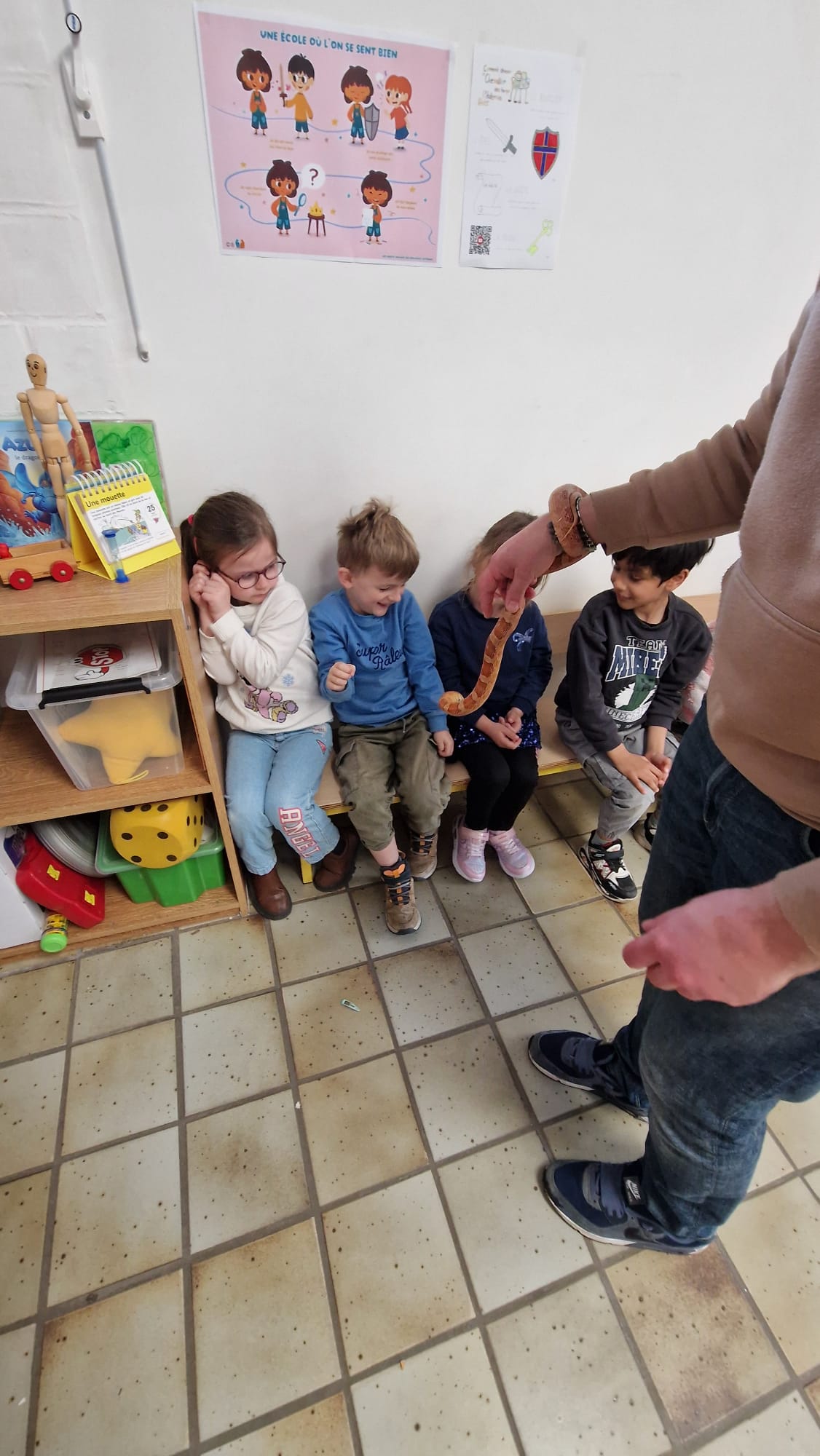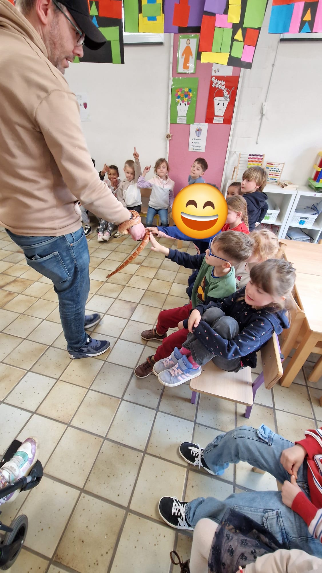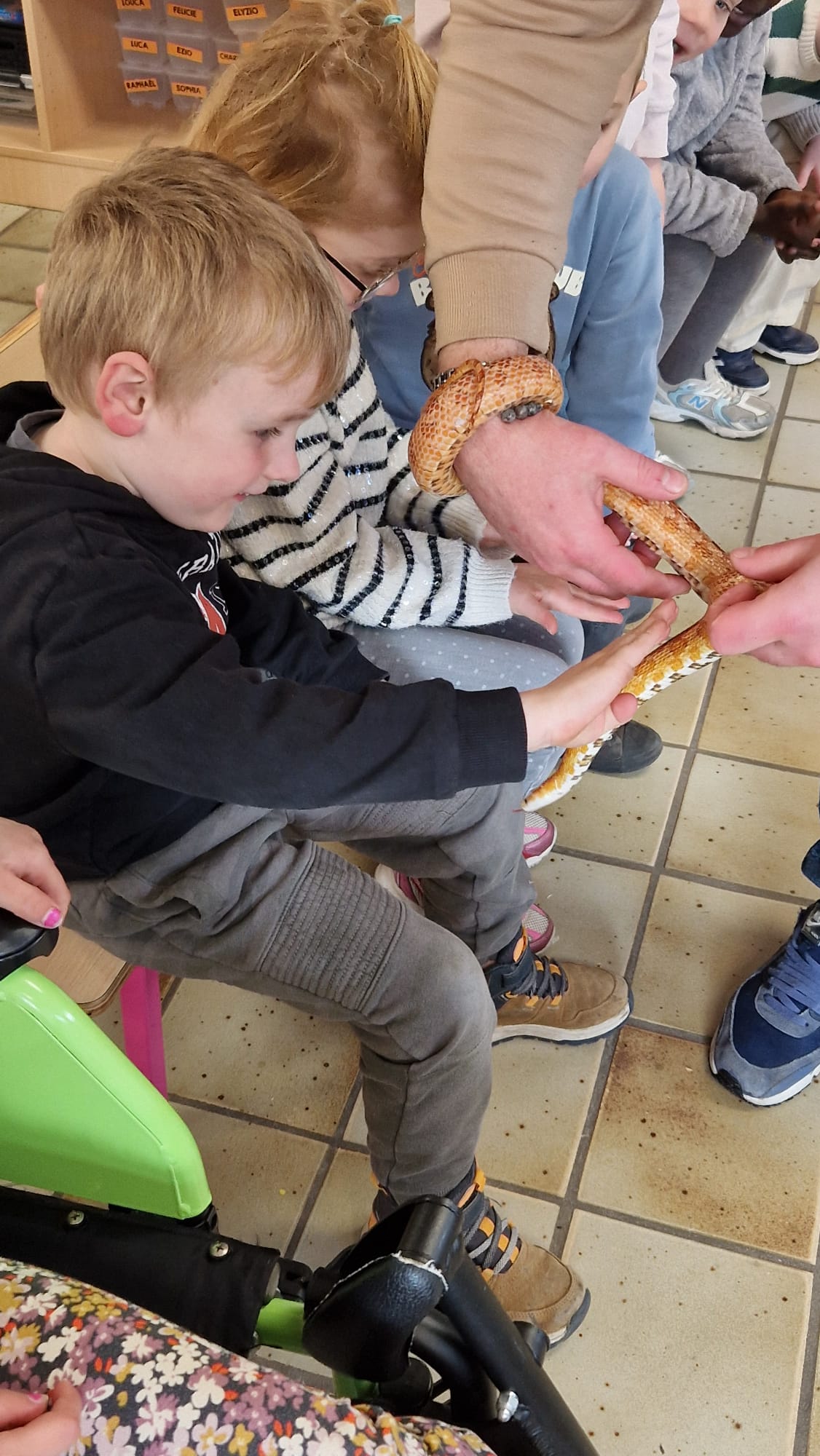 Ce mercredi 25 mars, nous avons reçu la visite de Ginou, le serpent de Kerissa. Son papa Damien nous a permis de découvrir cet animal extraordinaire et surtout de surmonter la peur des enfants. Les plus téméraires ont même pu le porter et le toucher. Quelle belle découverte en éveil scientifique