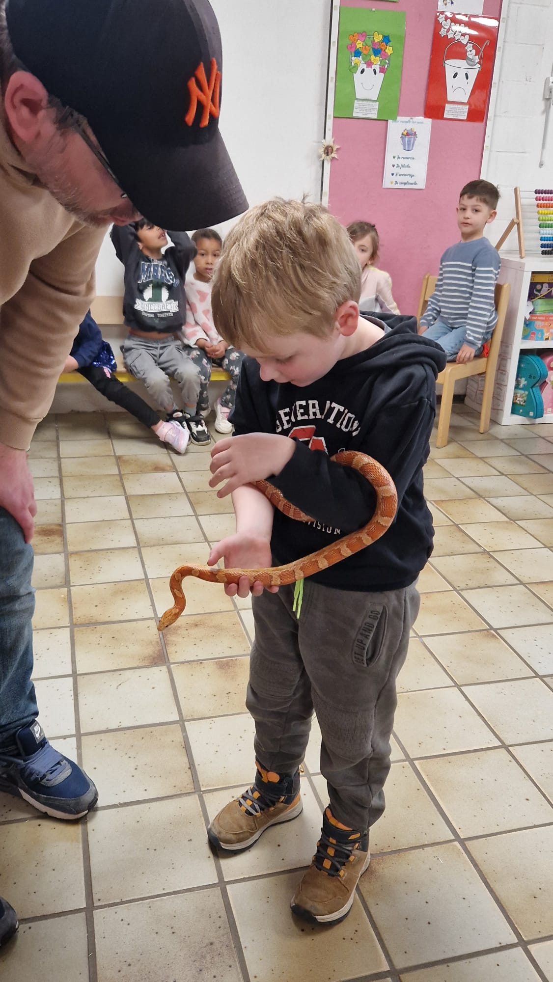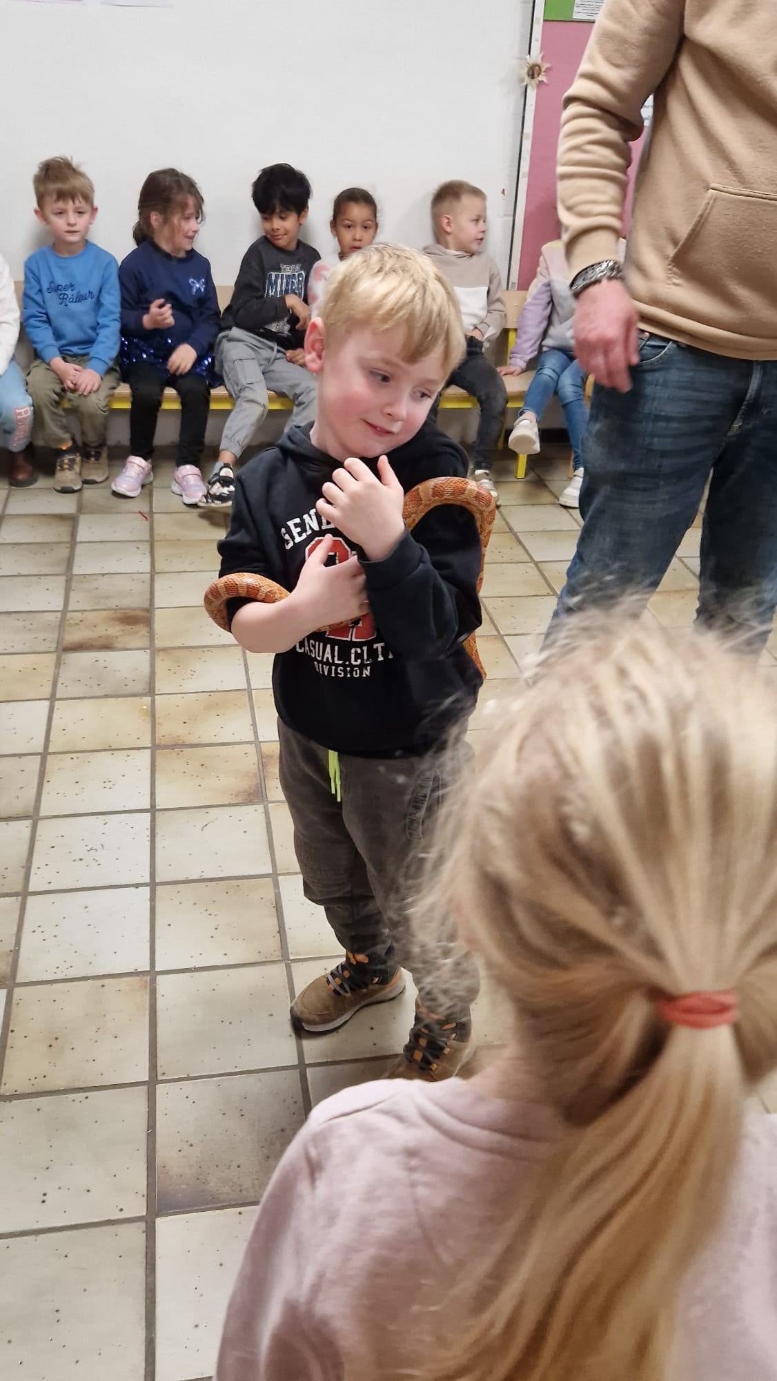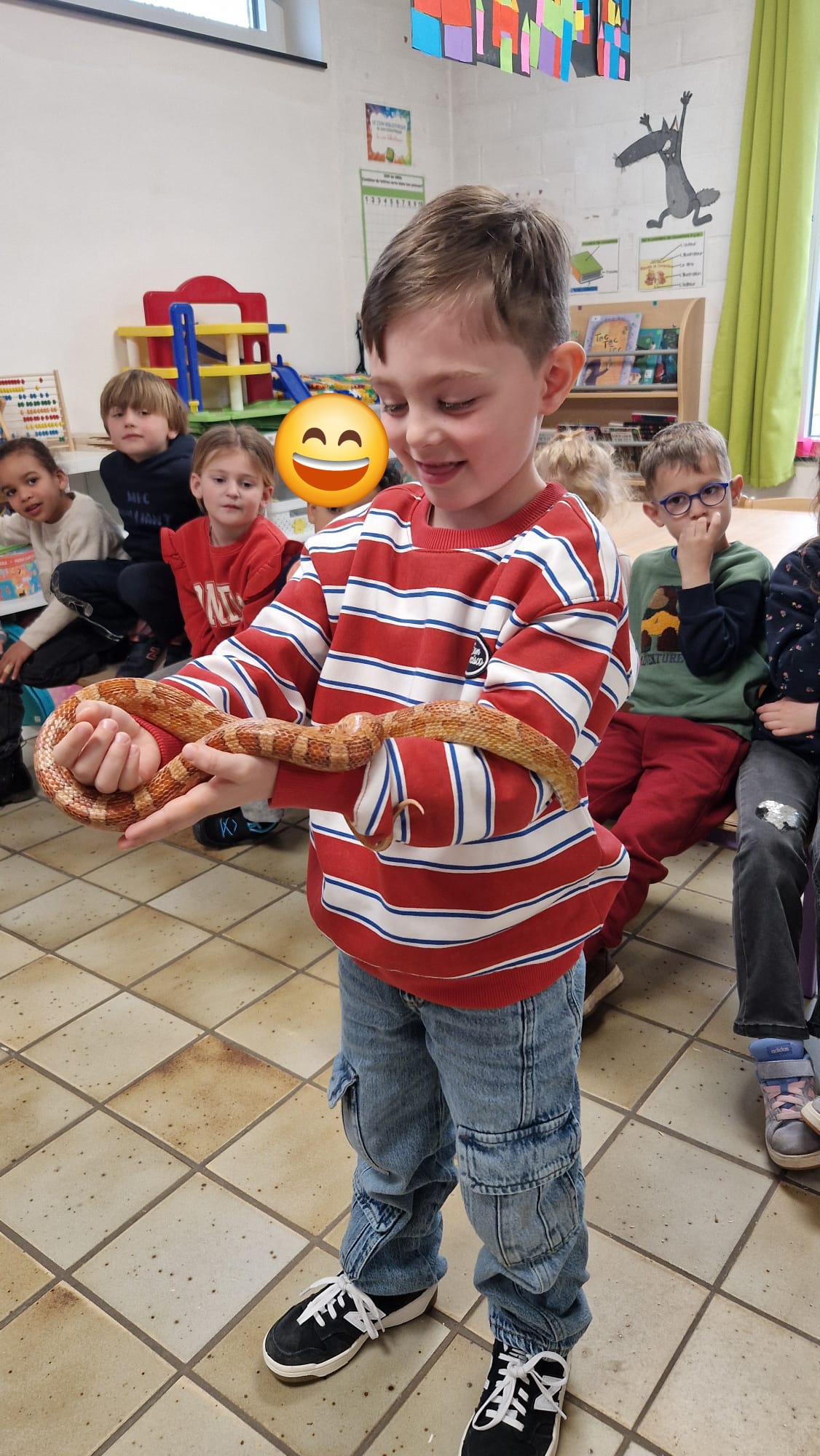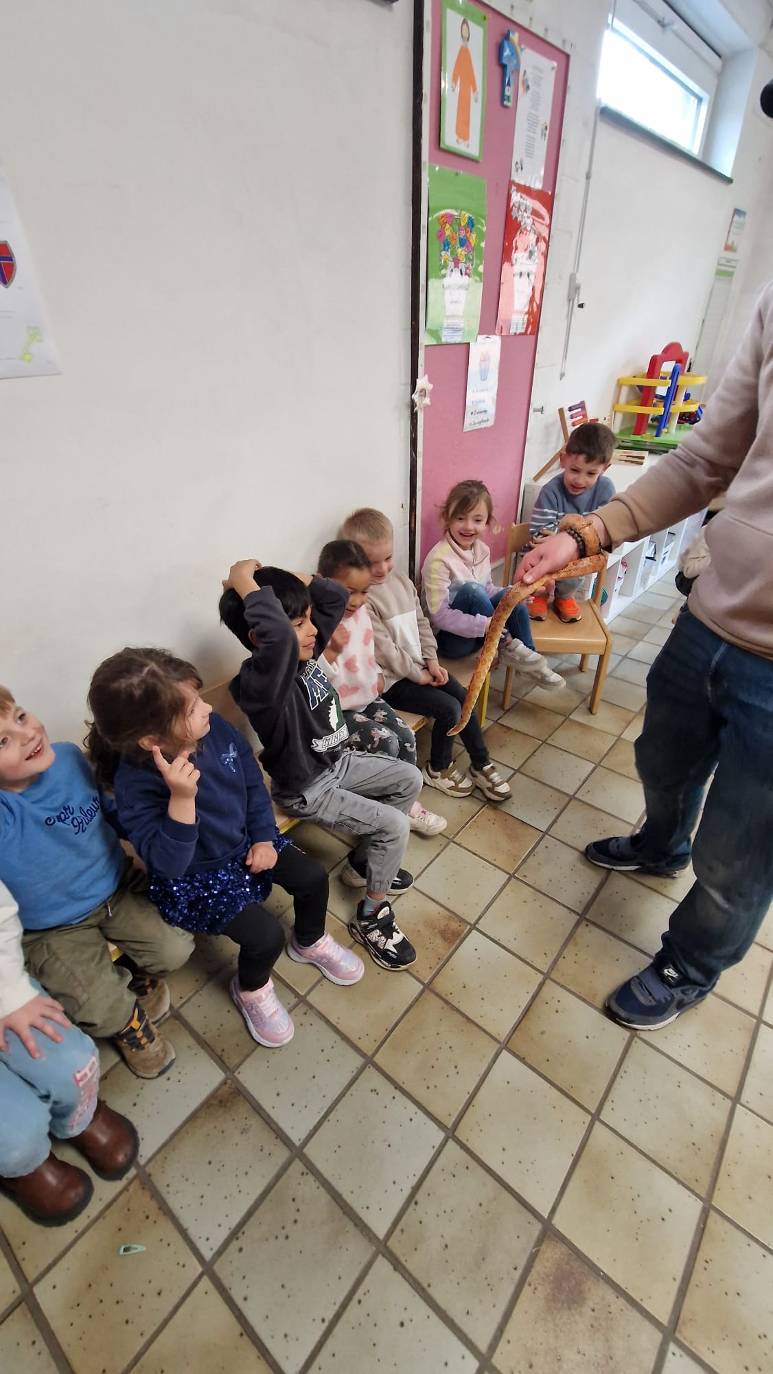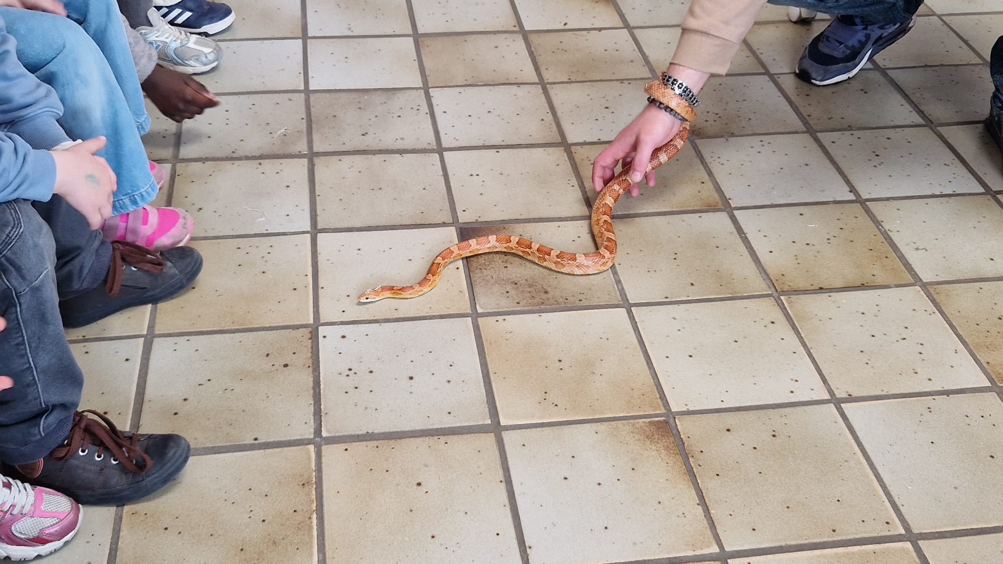 Ce mercredi 25 mars, nous avons reçu la visite de Ginou, le serpent de Kerissa. Son papa Damien nous a permis de découvrir cet animal extraordinaire et surtout de surmonter la peur des enfants. Les plus téméraires ont même pu le porter et le toucher. Quelle belle découverte en éveil scientifique