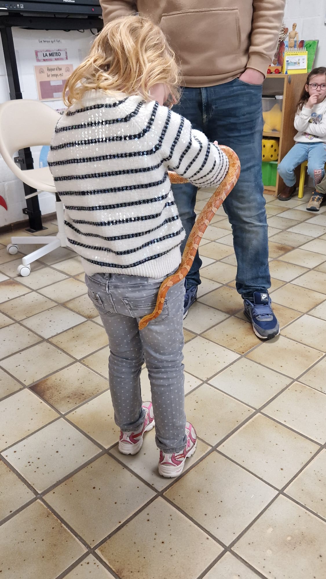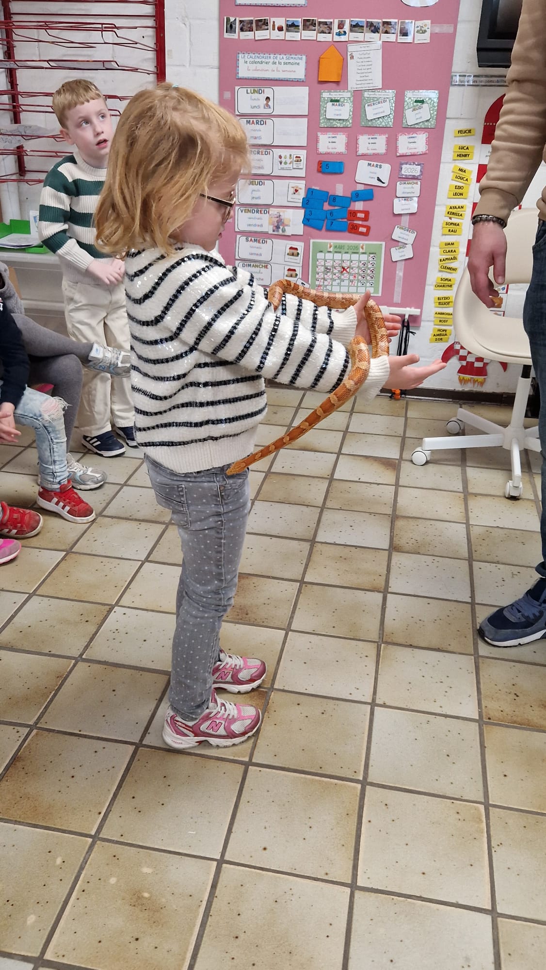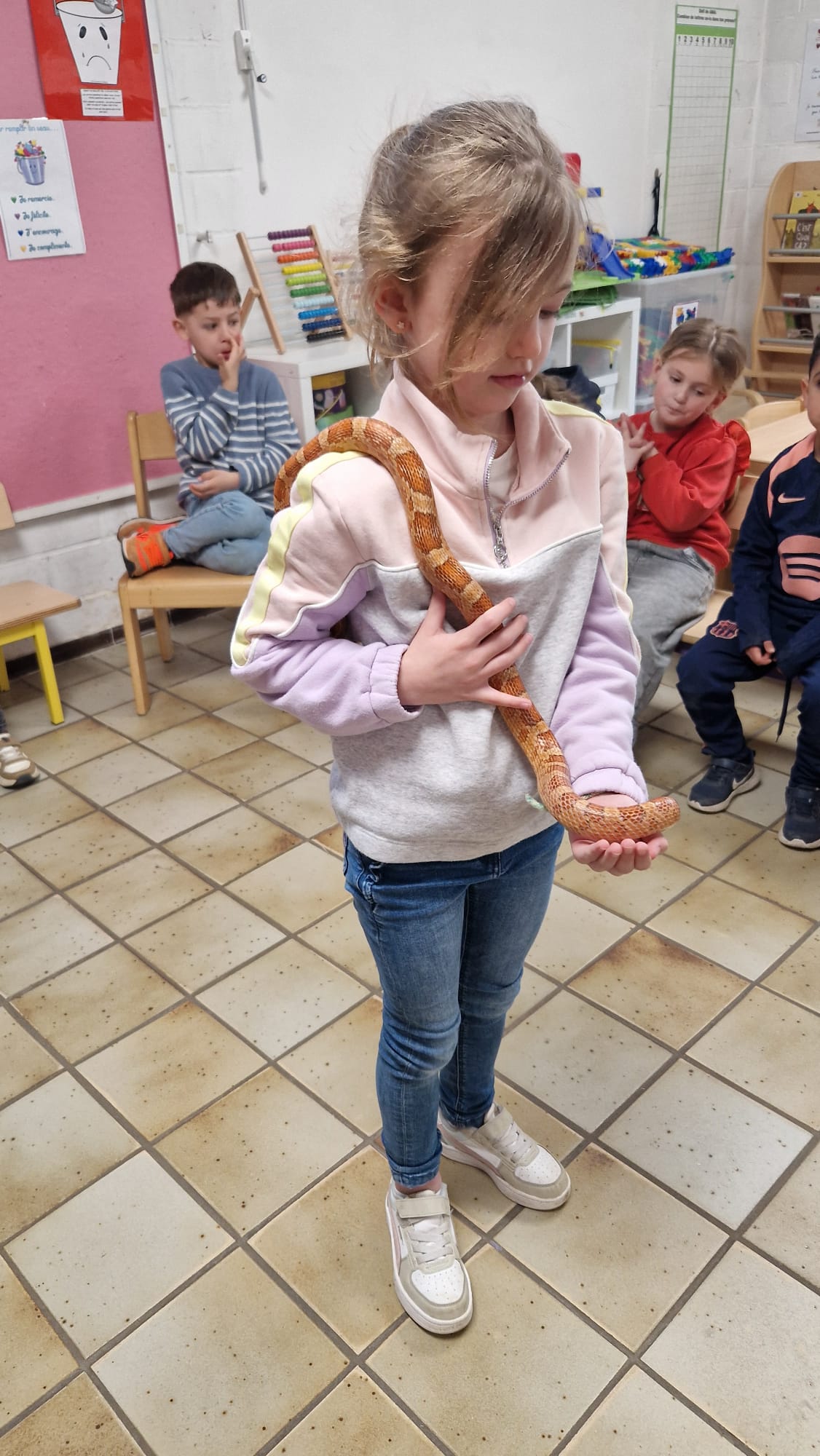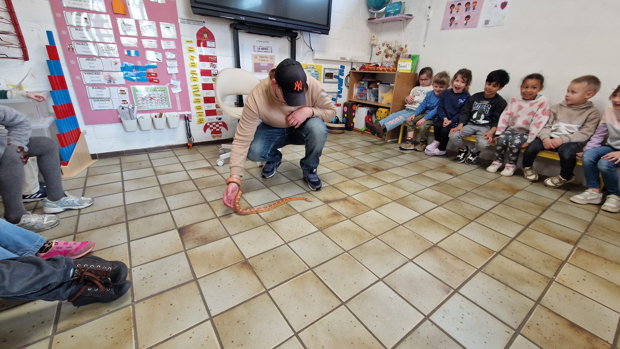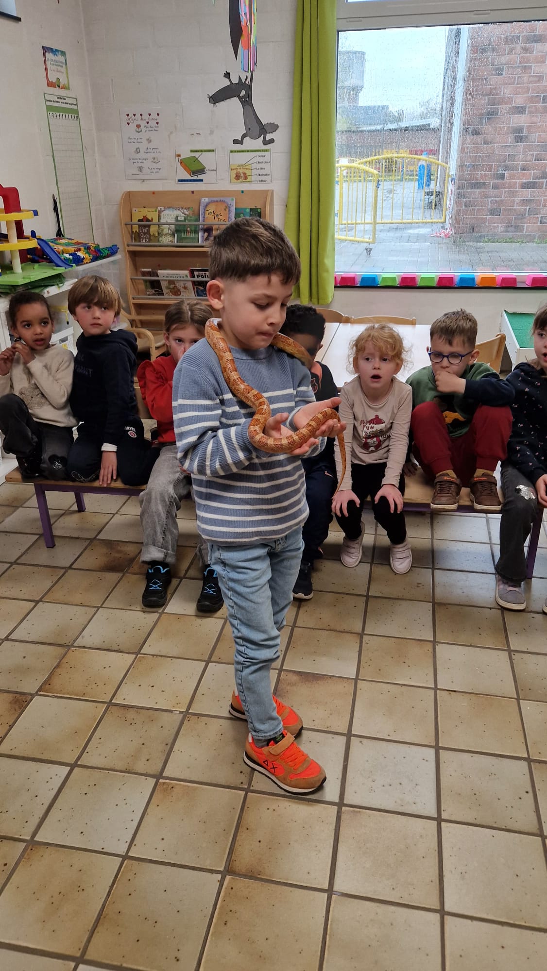 Ce mercredi 25 mars, nous avons reçu la visite de Ginou, le serpent de Kerissa. Son papa Damien nous a permis de découvrir cet animal extraordinaire et surtout de surmonter la peur des enfants. Les plus téméraires ont même pu le porter et le toucher. Quelle belle découverte en éveil scientifique