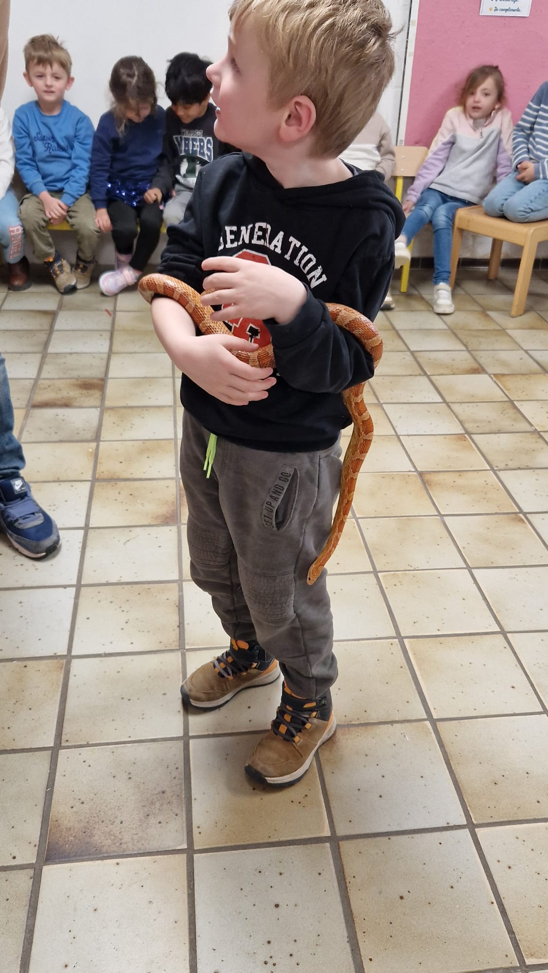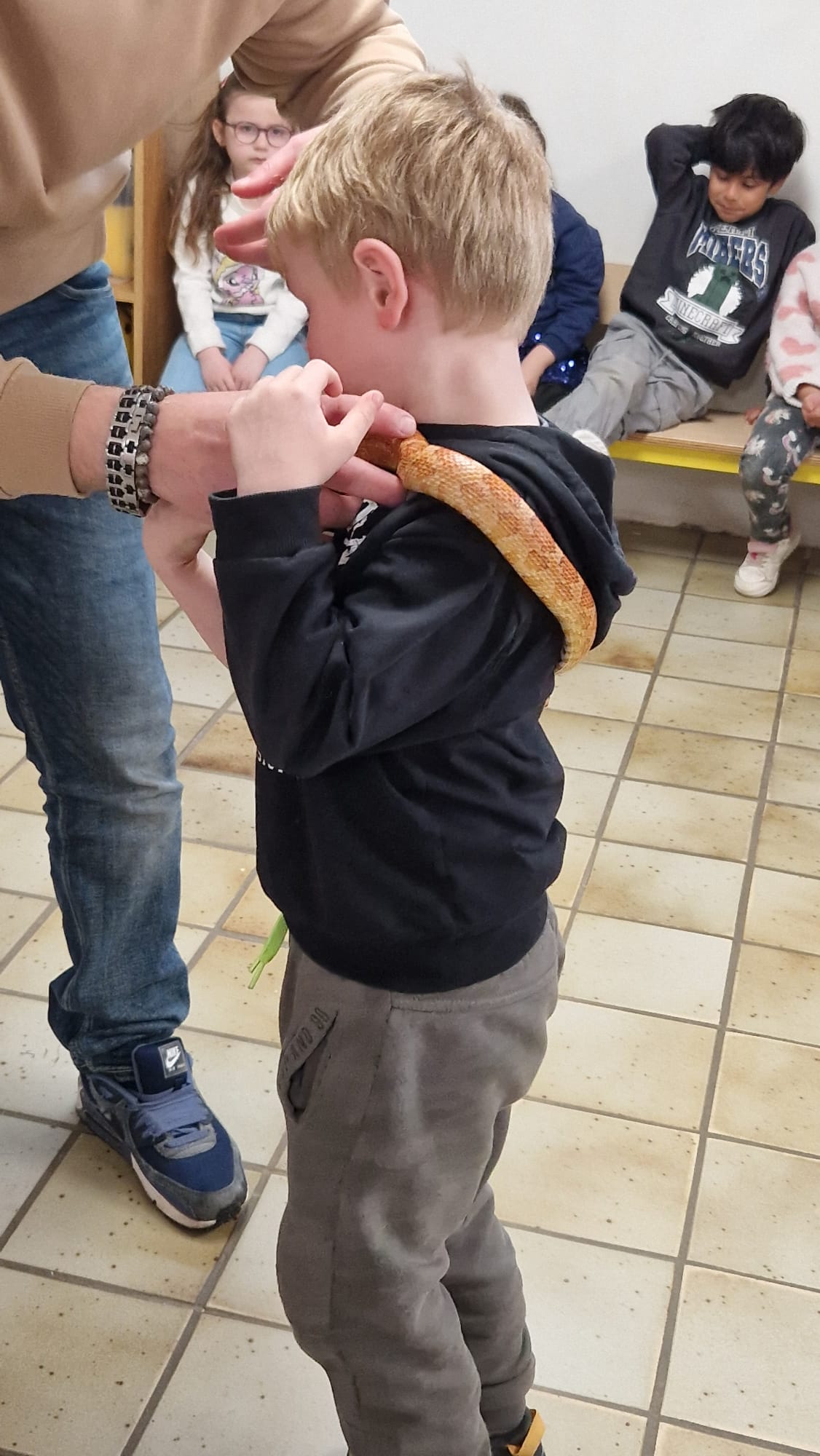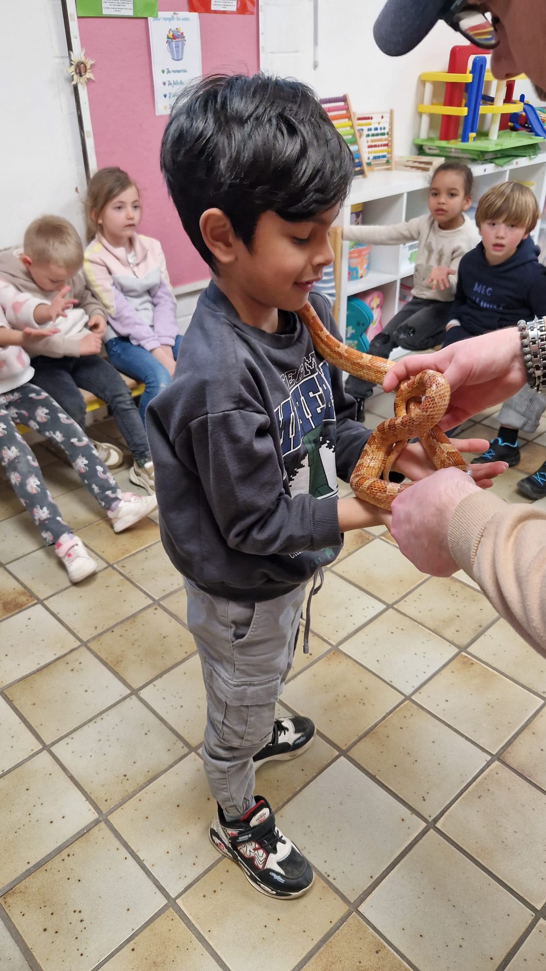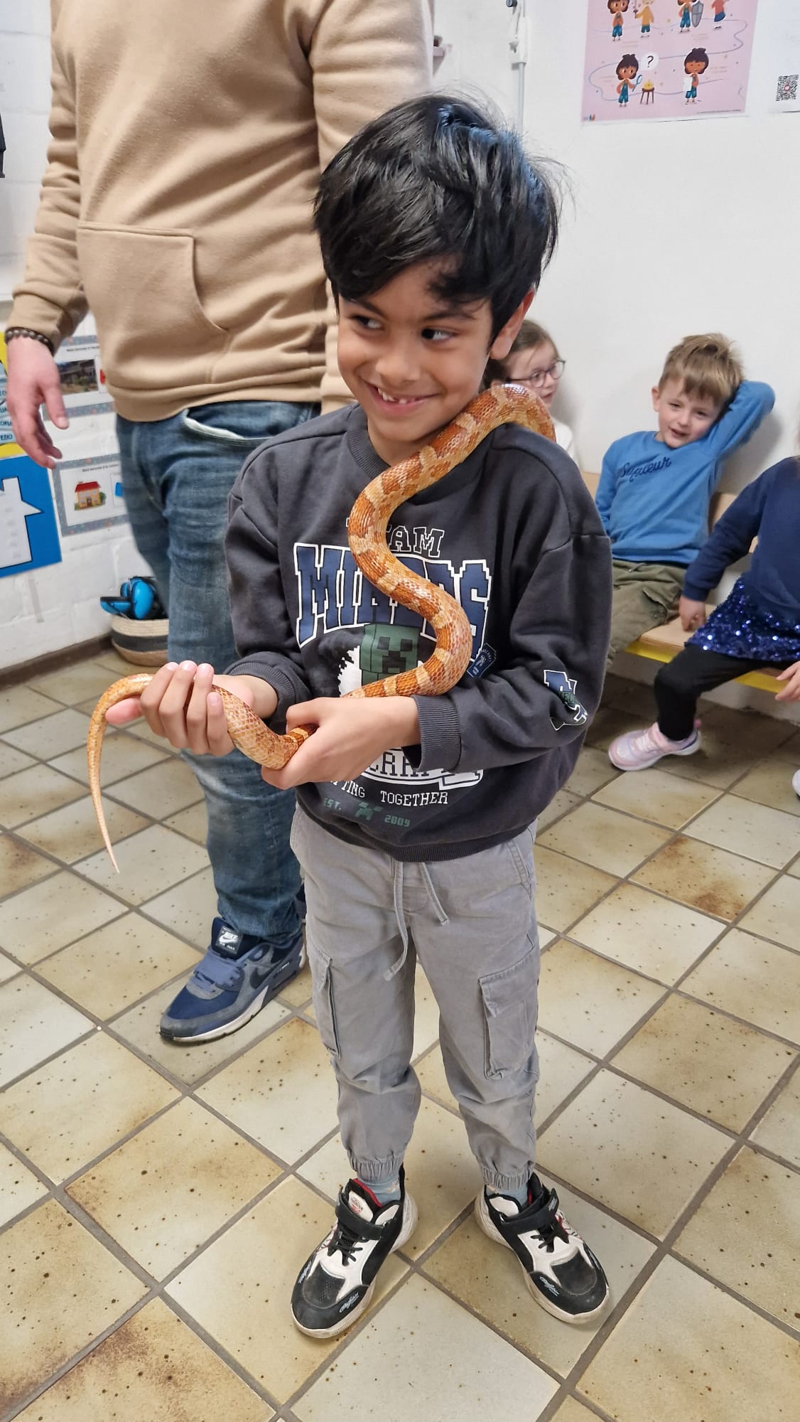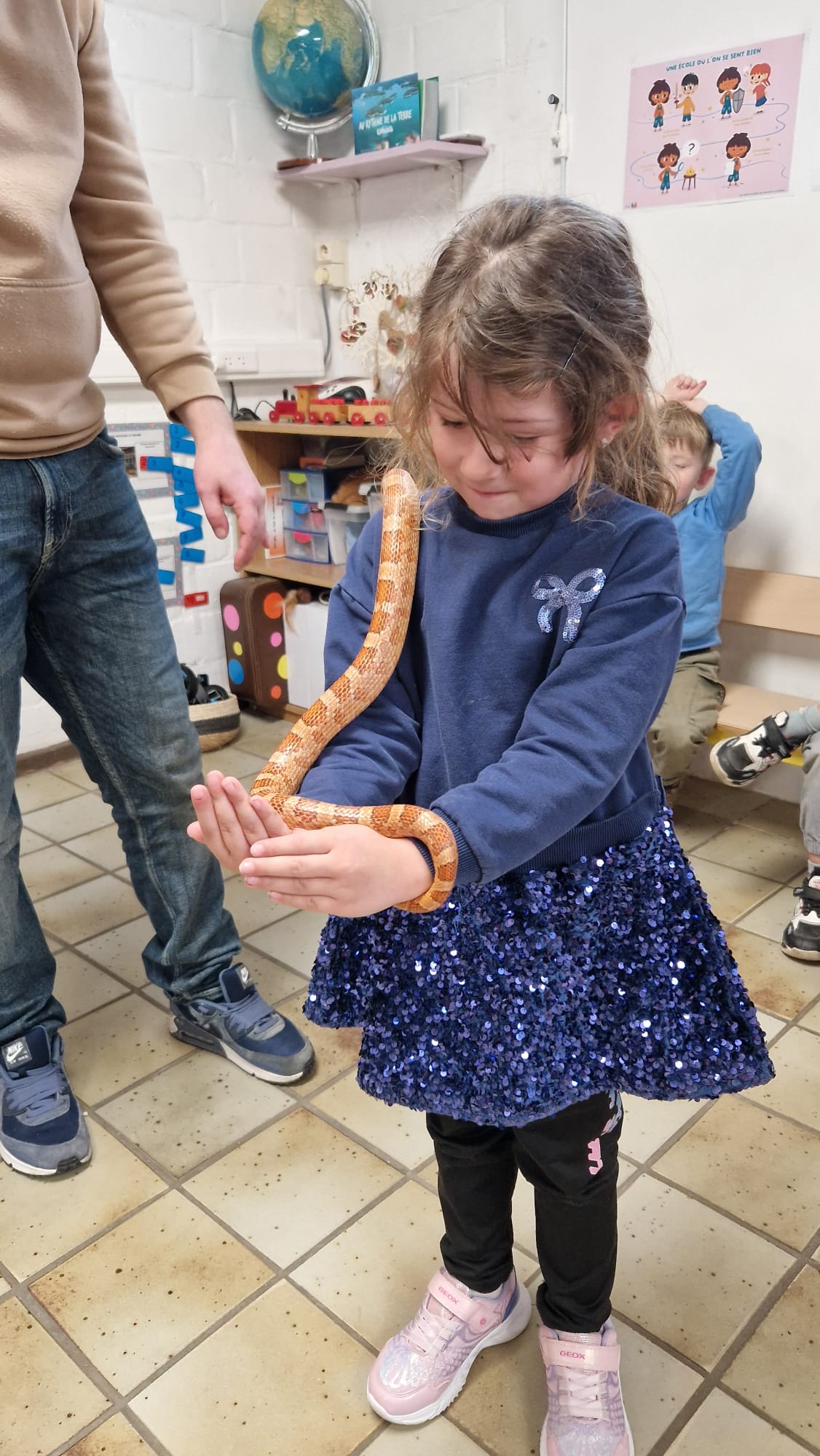 Ce mercredi 25 mars, nous avons reçu la visite de Ginou, le serpent de Kerissa. Son papa Damien nous a permis de découvrir cet animal extraordinaire et surtout de surmonter la peur des enfants. Les plus téméraires ont même pu le porter et le toucher. Quelle belle découverte en éveil scientifique