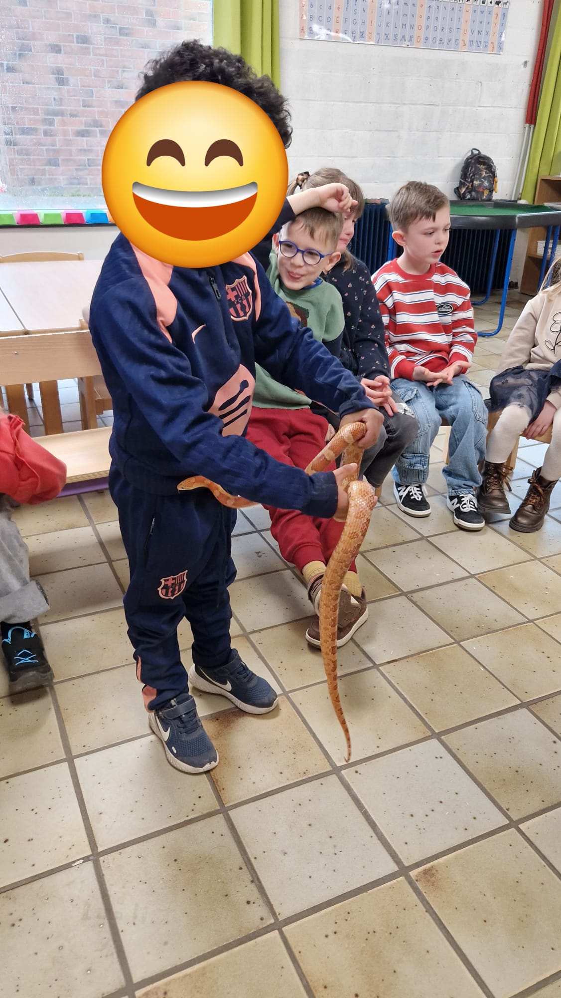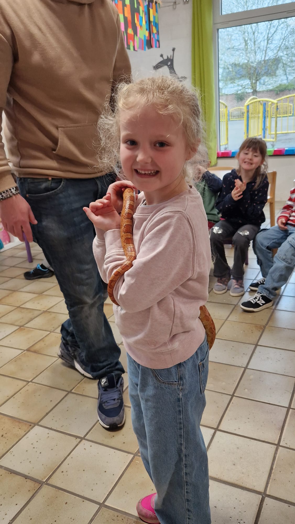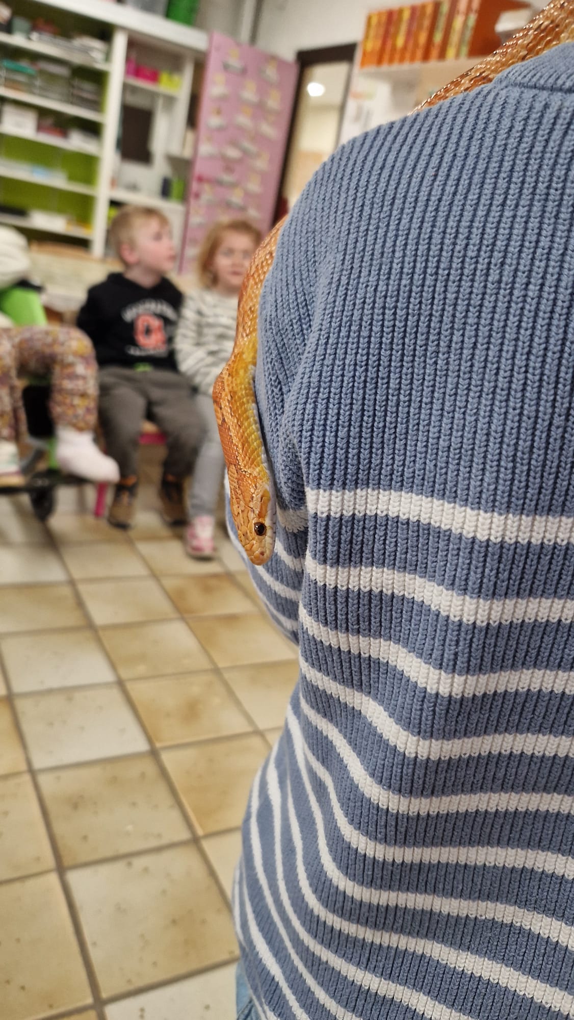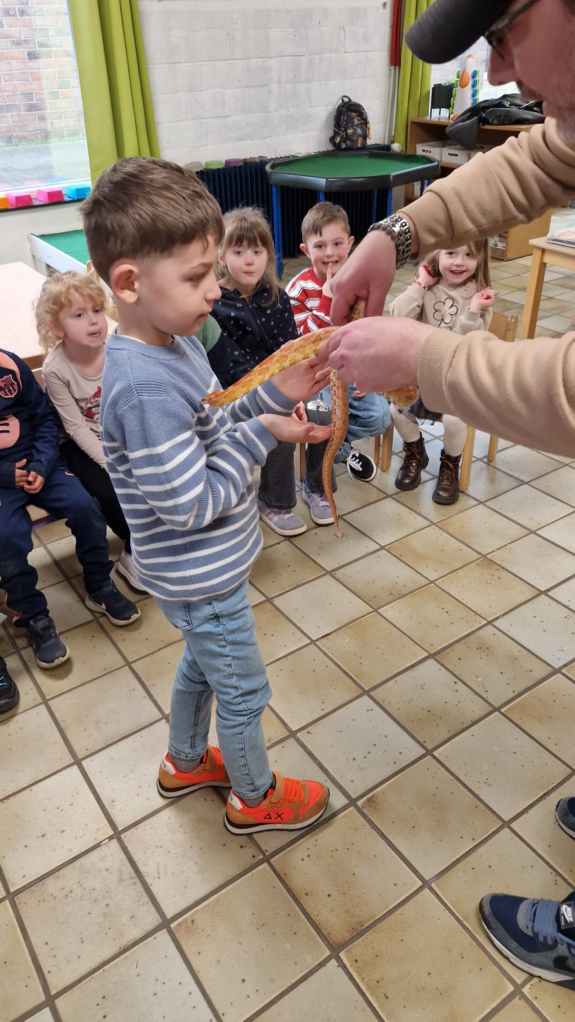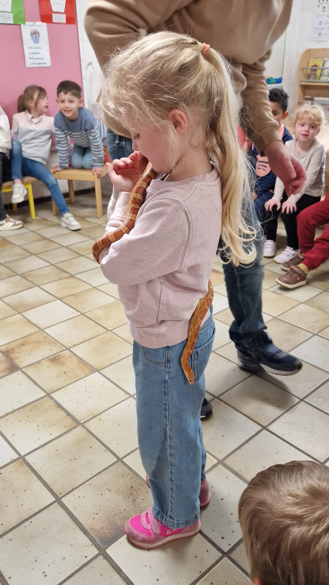 Ce mercredi 25 mars, nous avons reçu la visite de Ginou, le serpent de Kerissa. Son papa Damien nous a permis de découvrir cet animal extraordinaire et surtout de surmonter la peur des enfants. Les plus téméraires ont même pu le porter et le toucher. Quelle belle découverte en éveil scientifique