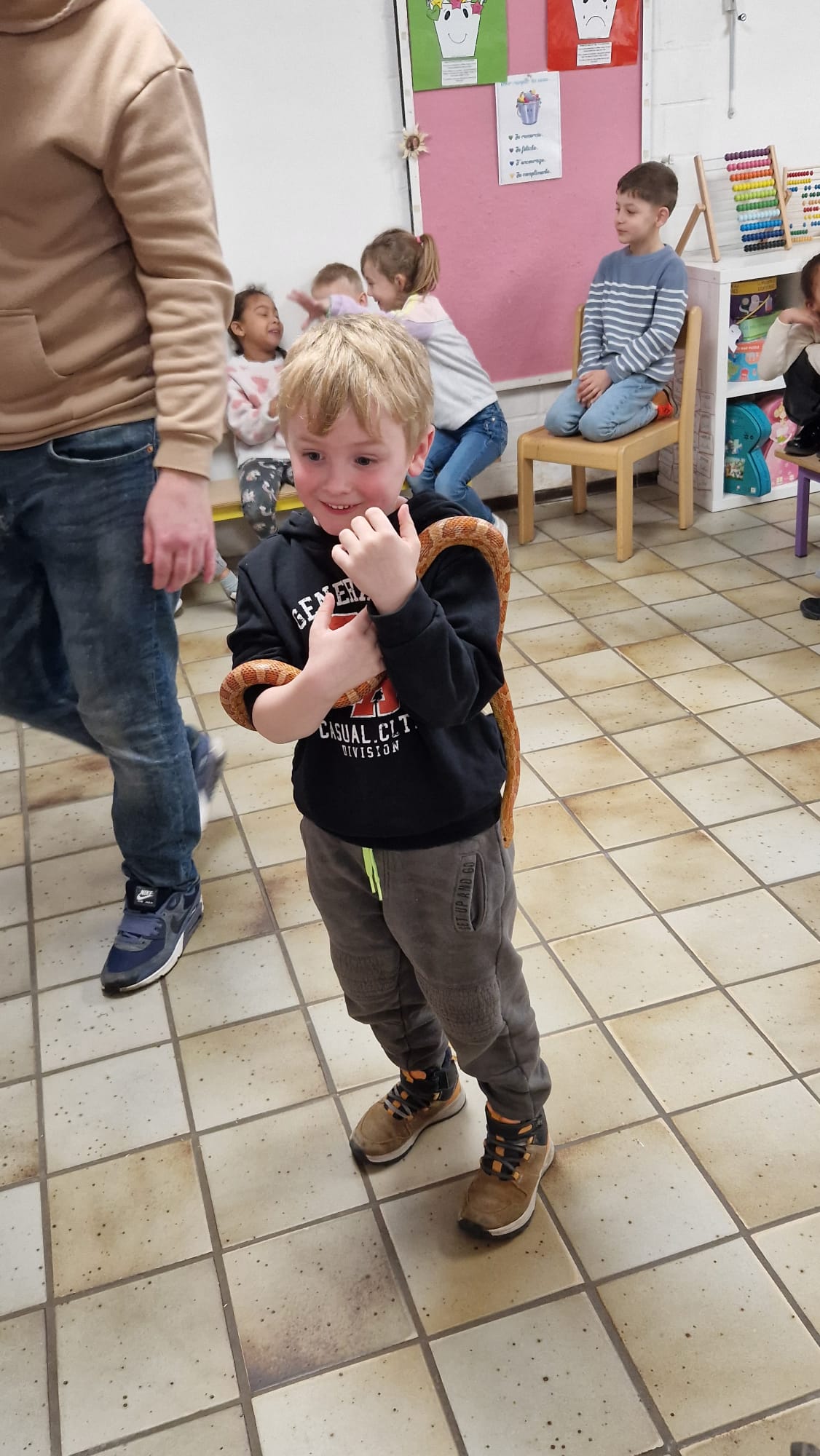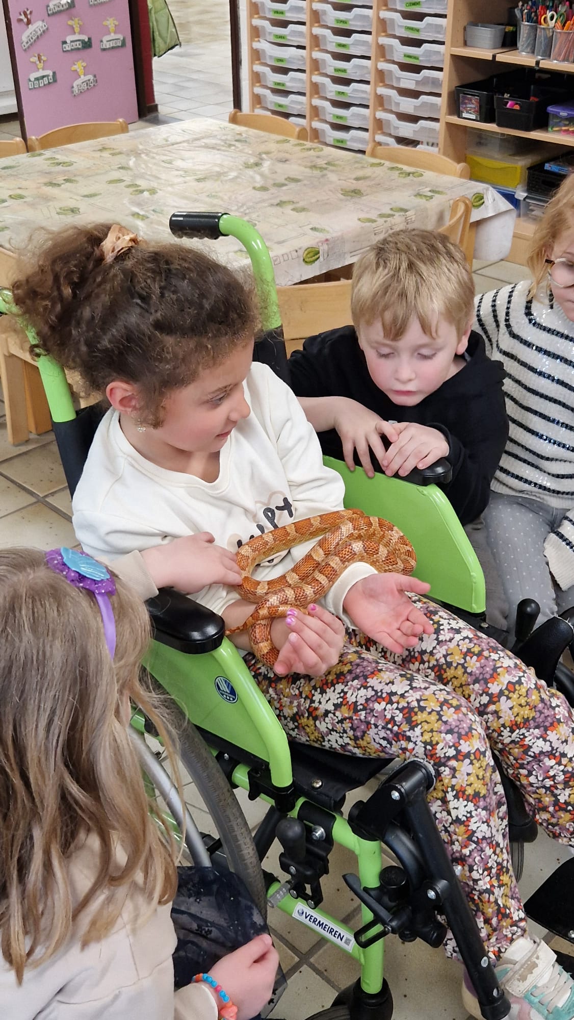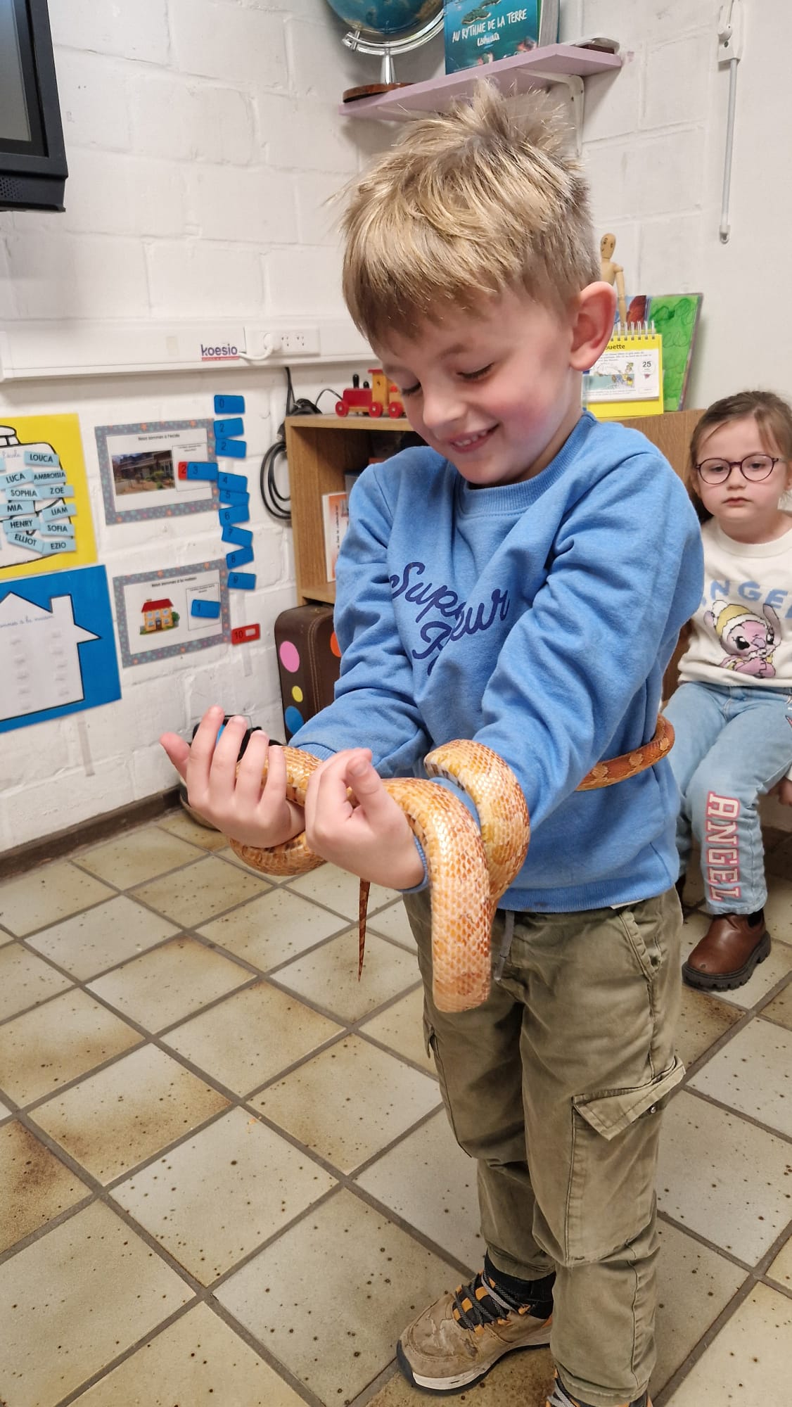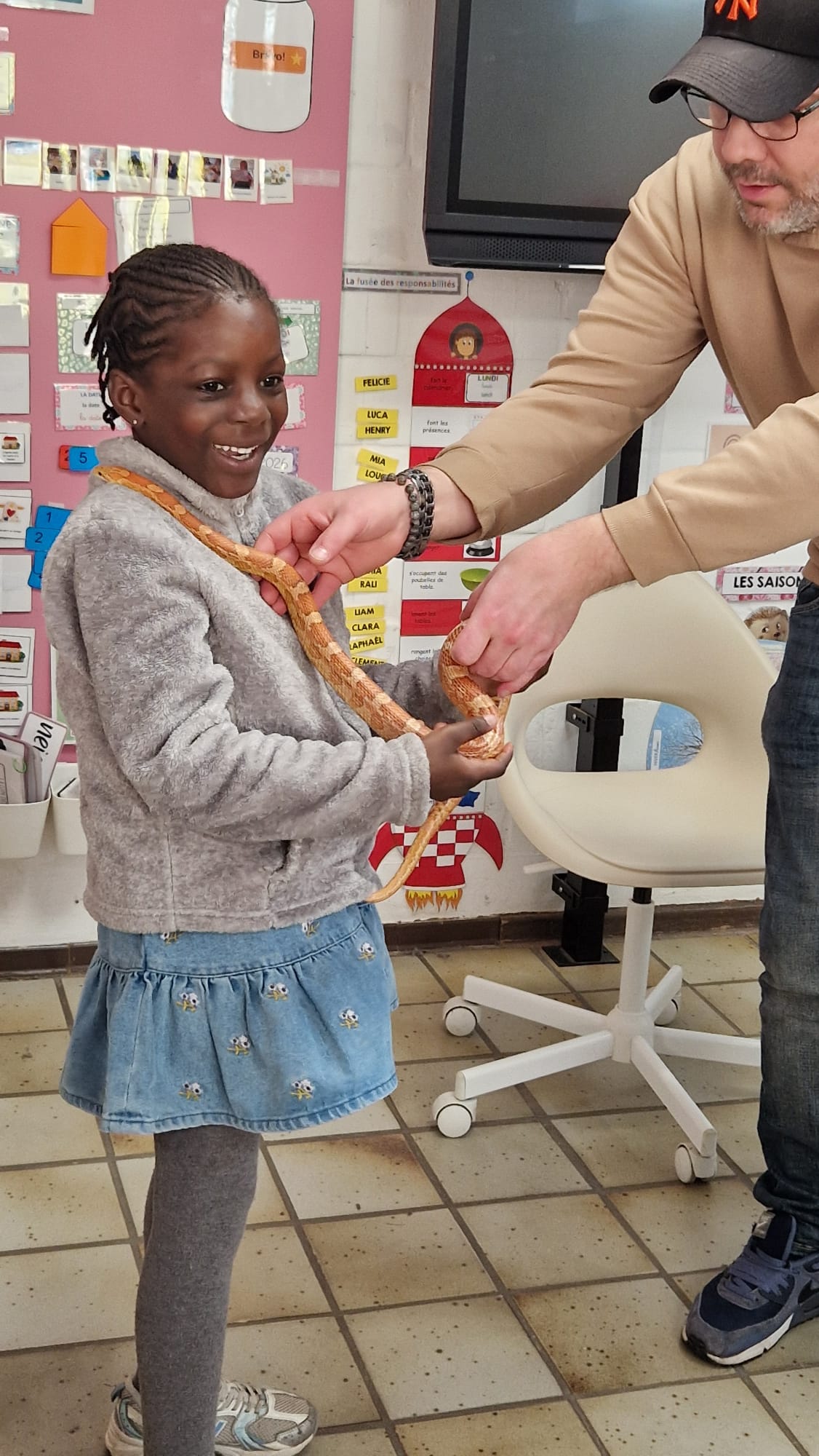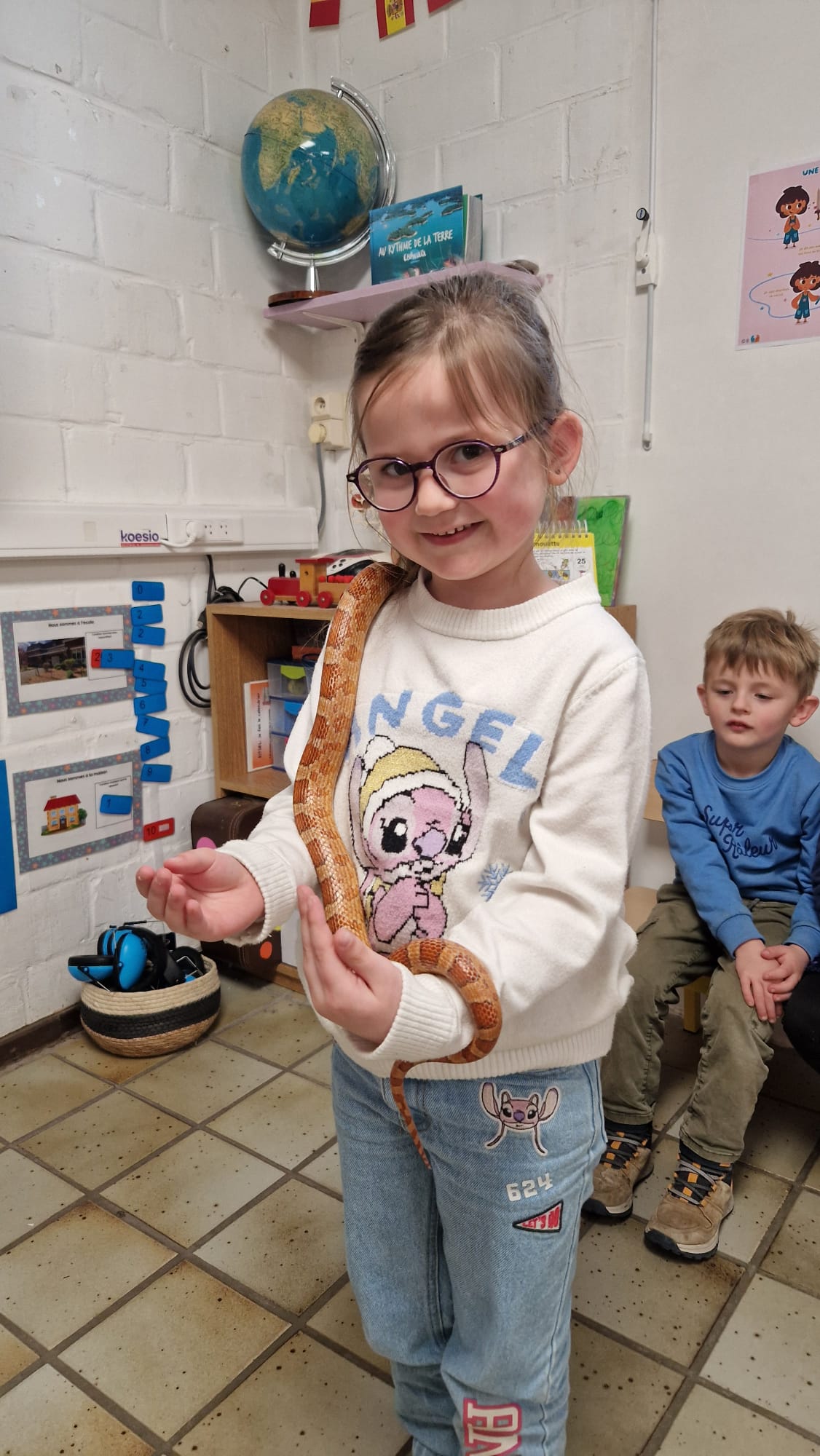 Ce mercredi 25 mars, nous avons reçu la visite de Ginou, le serpent de Kerissa. Son papa Damien nous a permis de découvrir cet animal extraordinaire et surtout de surmonter la peur des enfants. Les plus téméraires ont même pu le porter et le toucher. Quelle belle découverte en éveil scientifique
