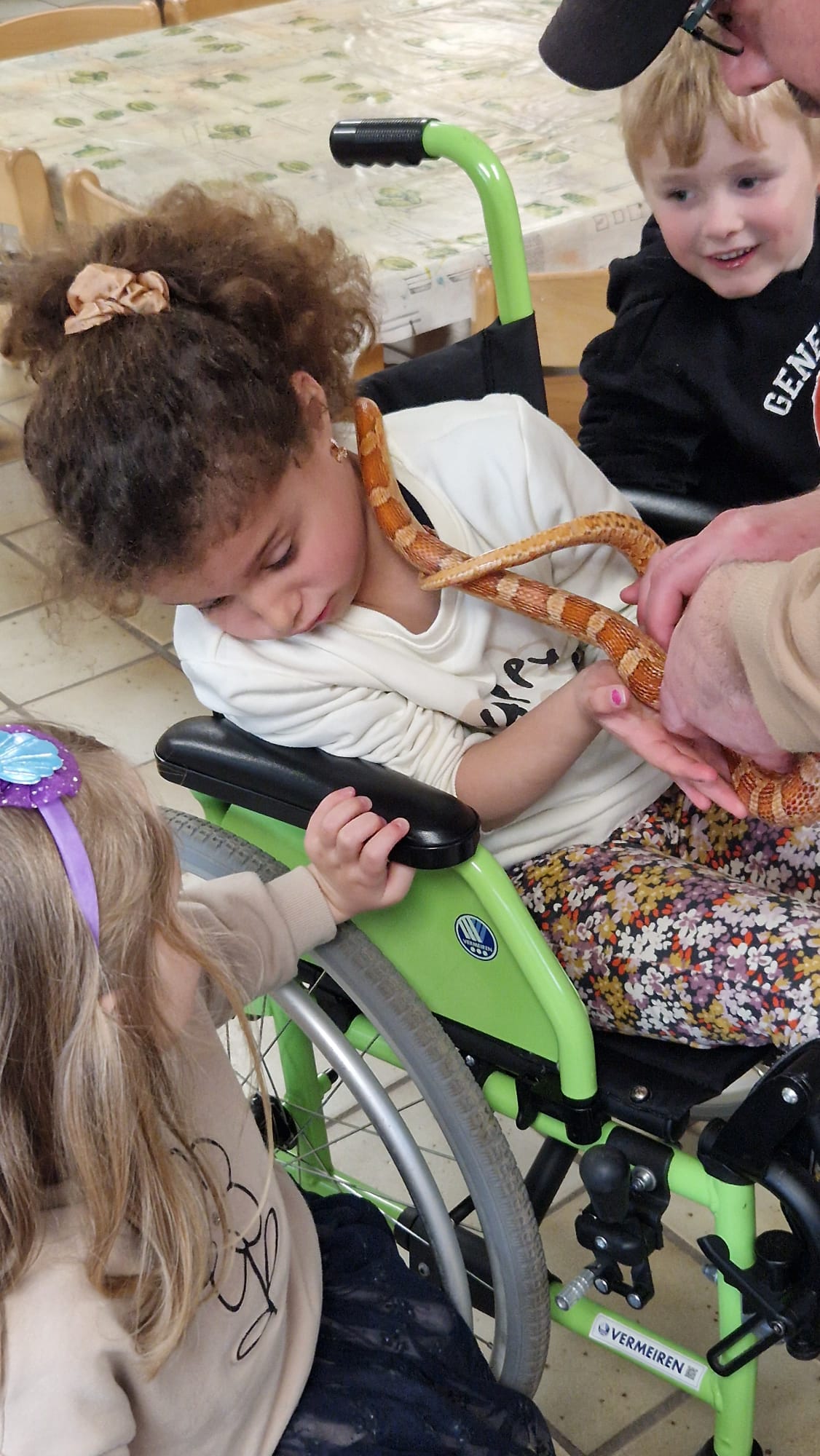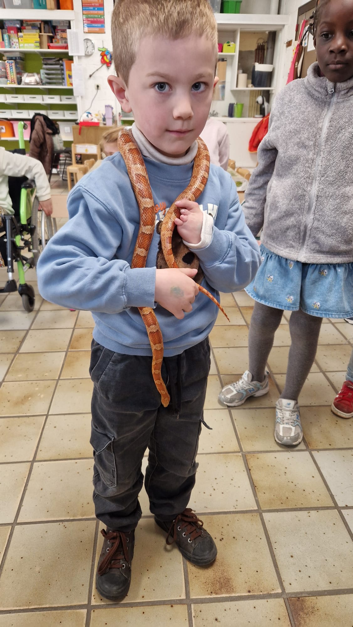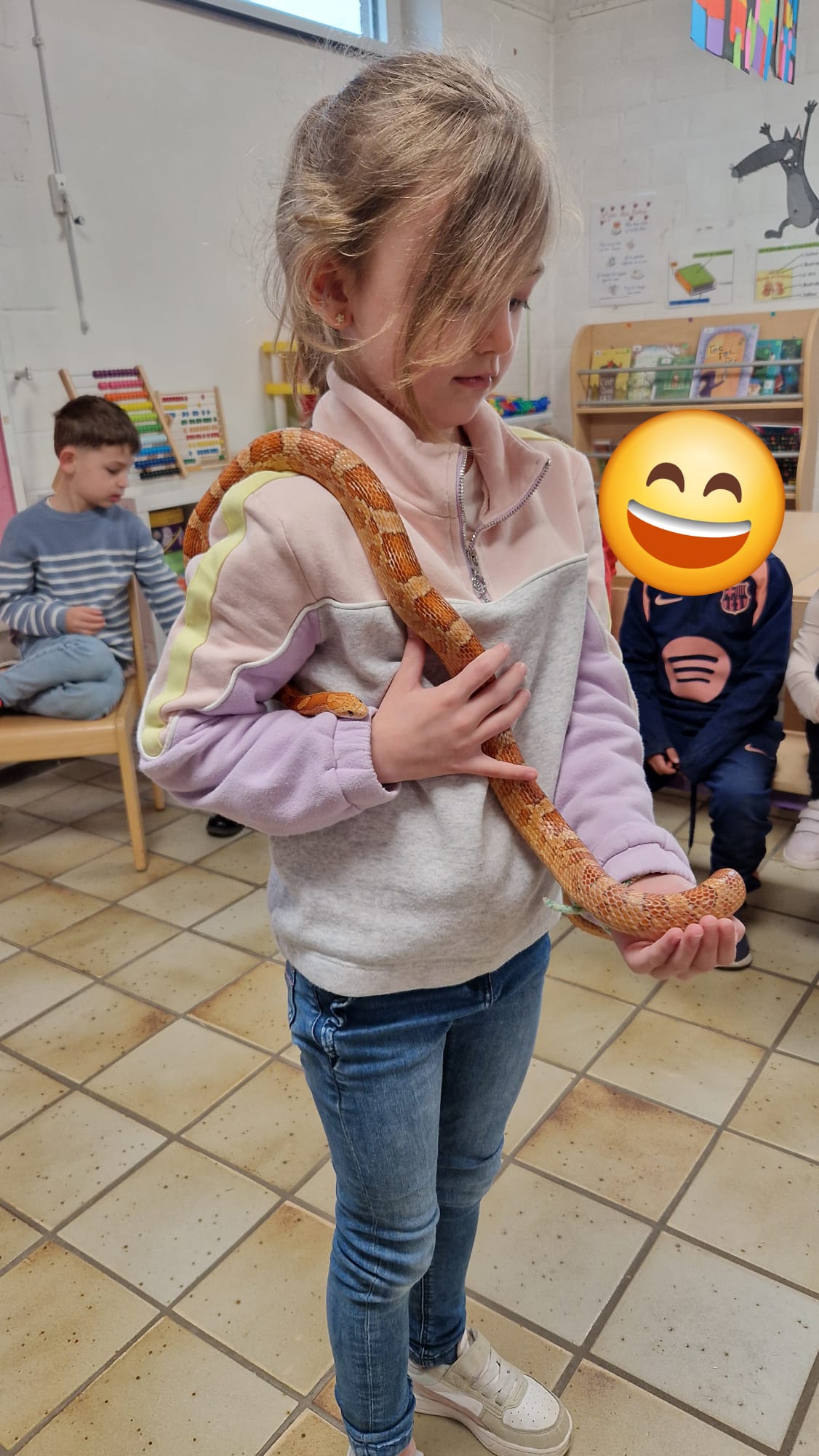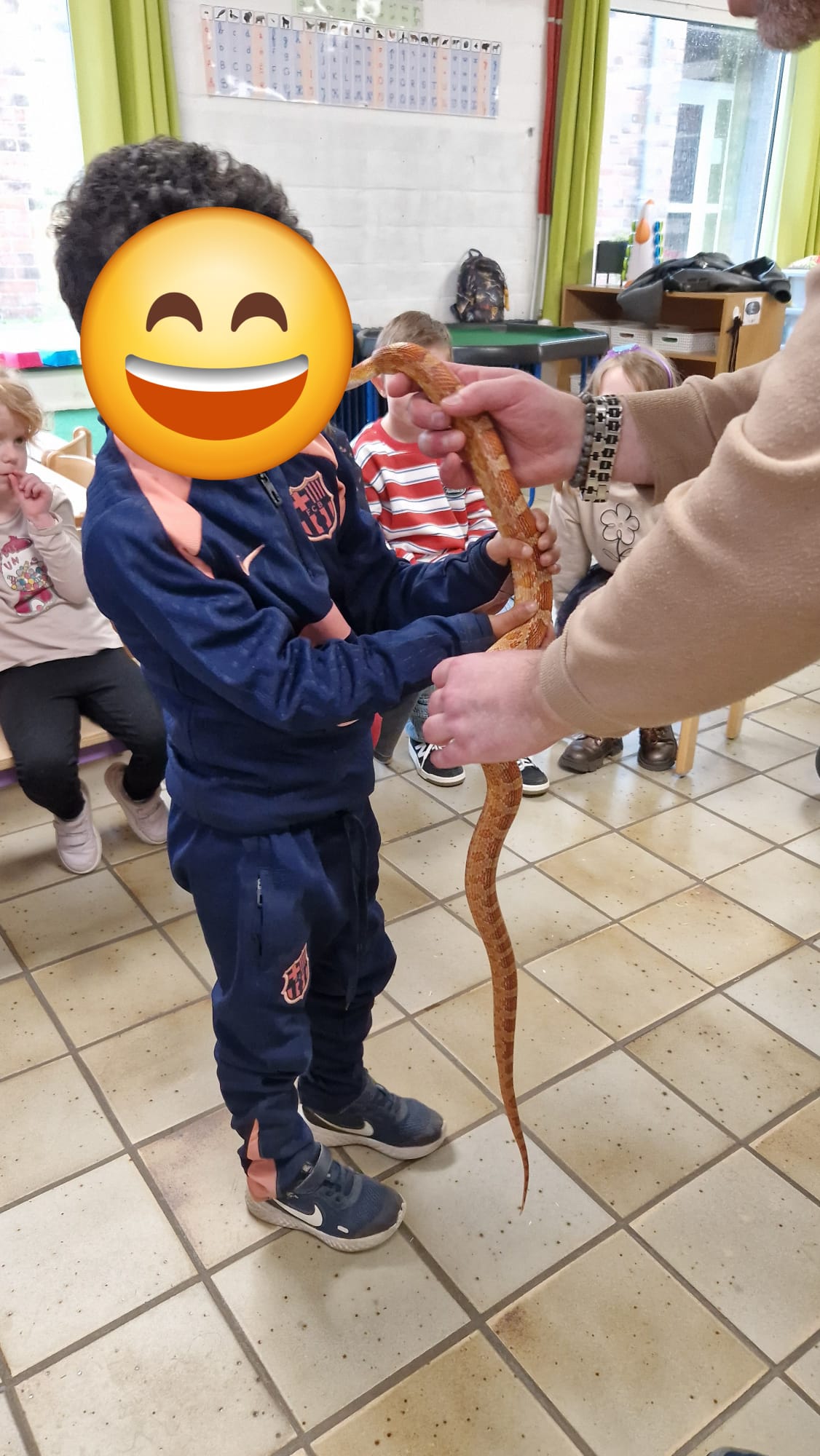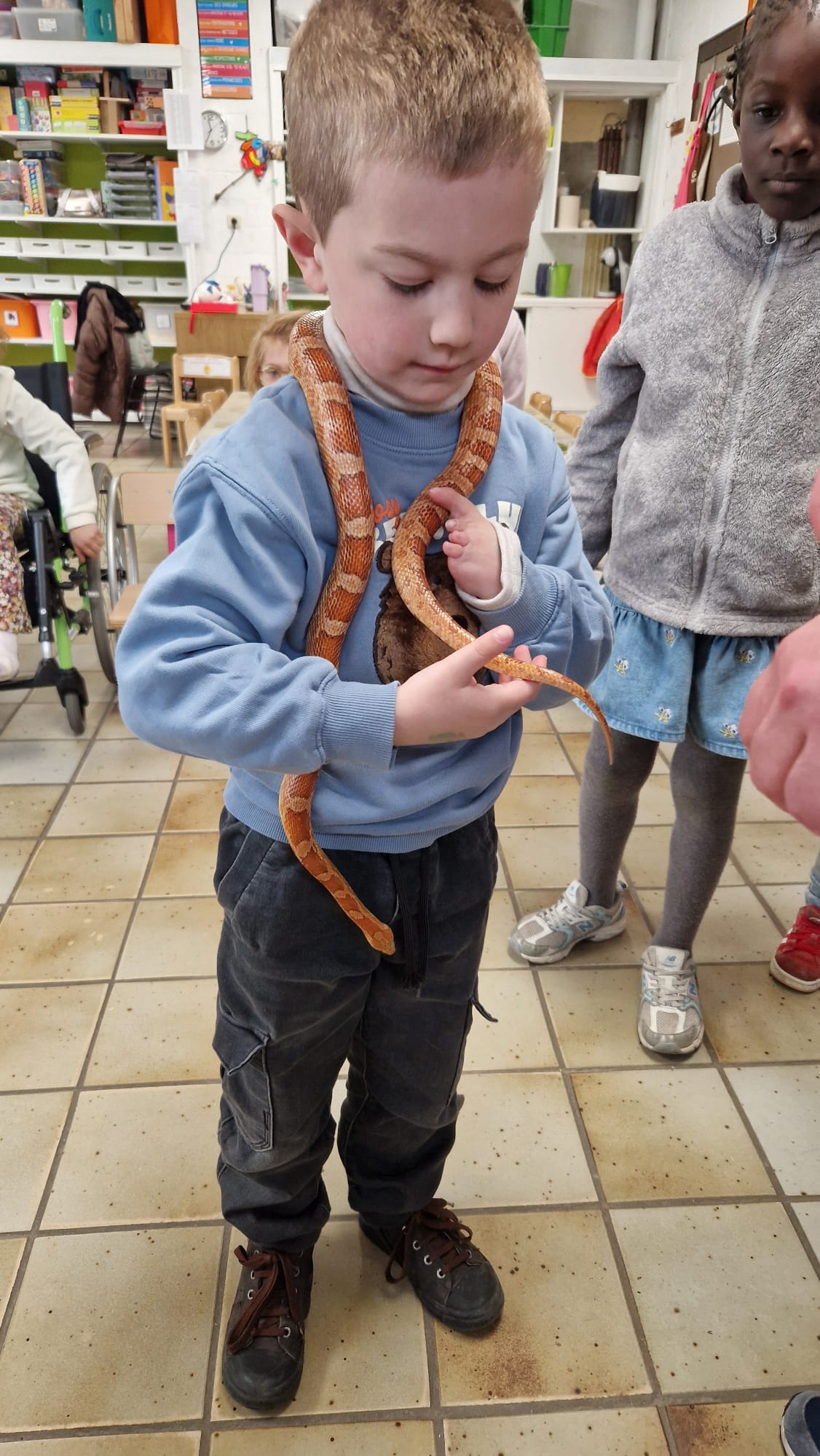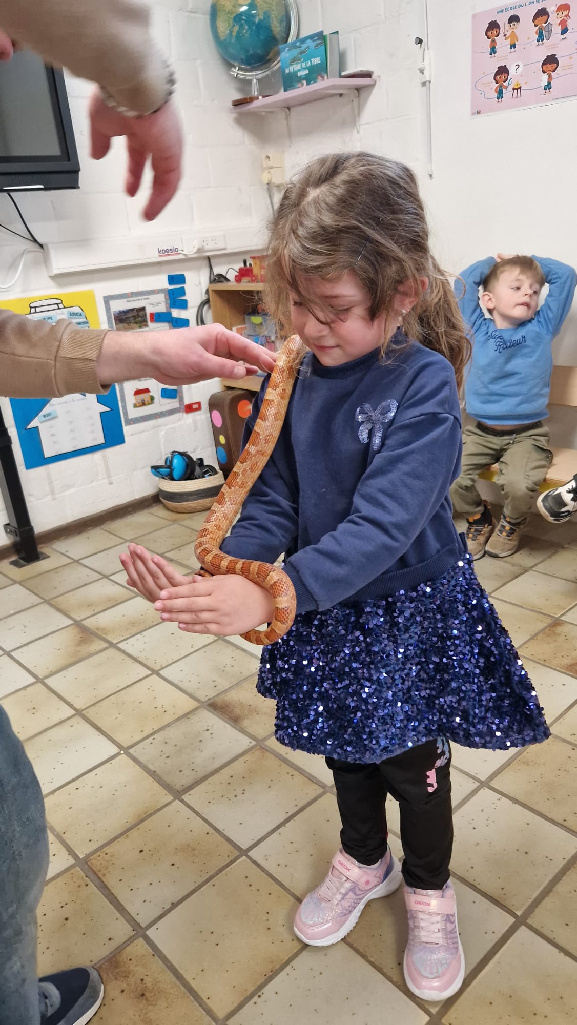 Ce mercredi 25 mars, nous avons reçu la visite de Ginou, le serpent de Kerissa. Son papa Damien nous a permis de découvrir cet animal extraordinaire et surtout de surmonter la peur des enfants. Les plus téméraires ont même pu le porter et le toucher. Quelle belle découverte en éveil scientifique