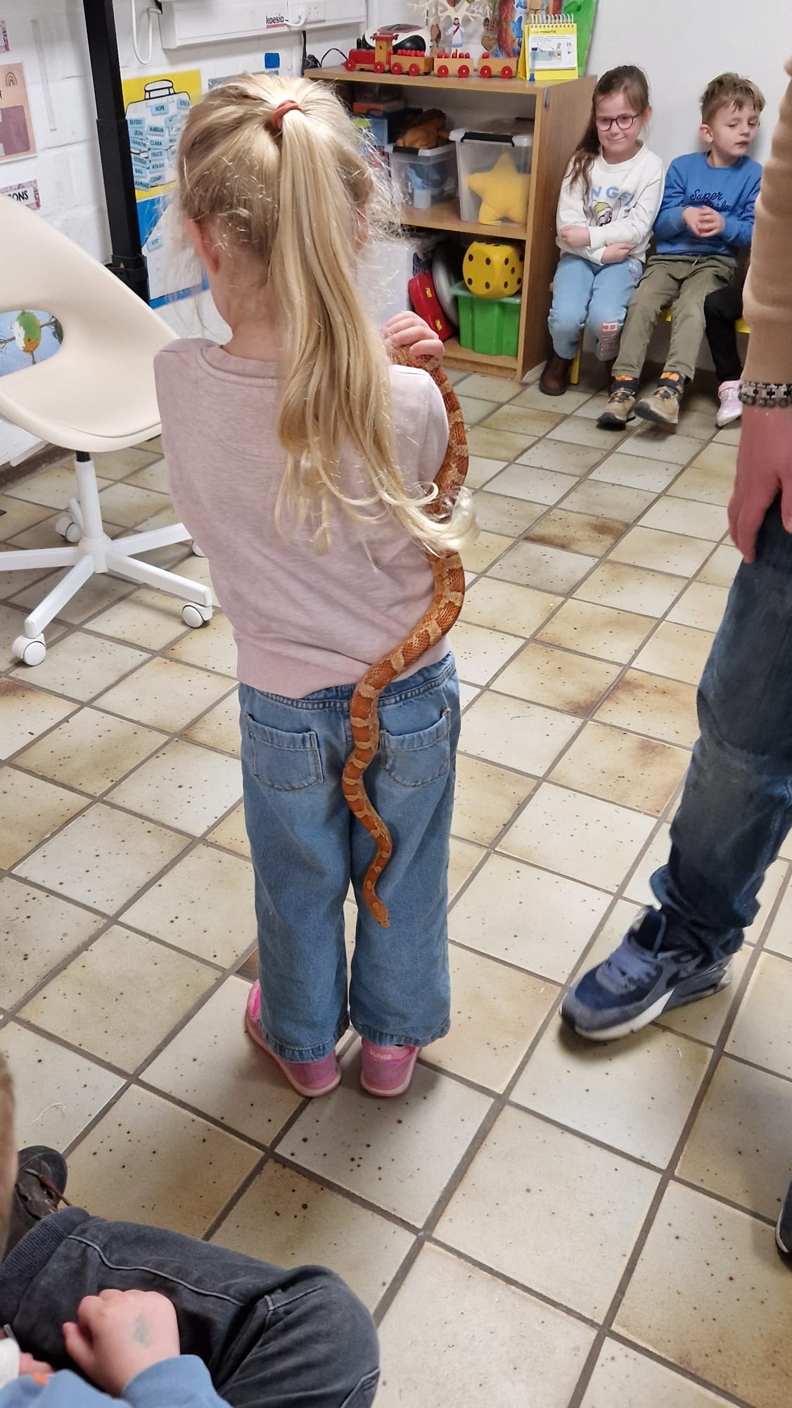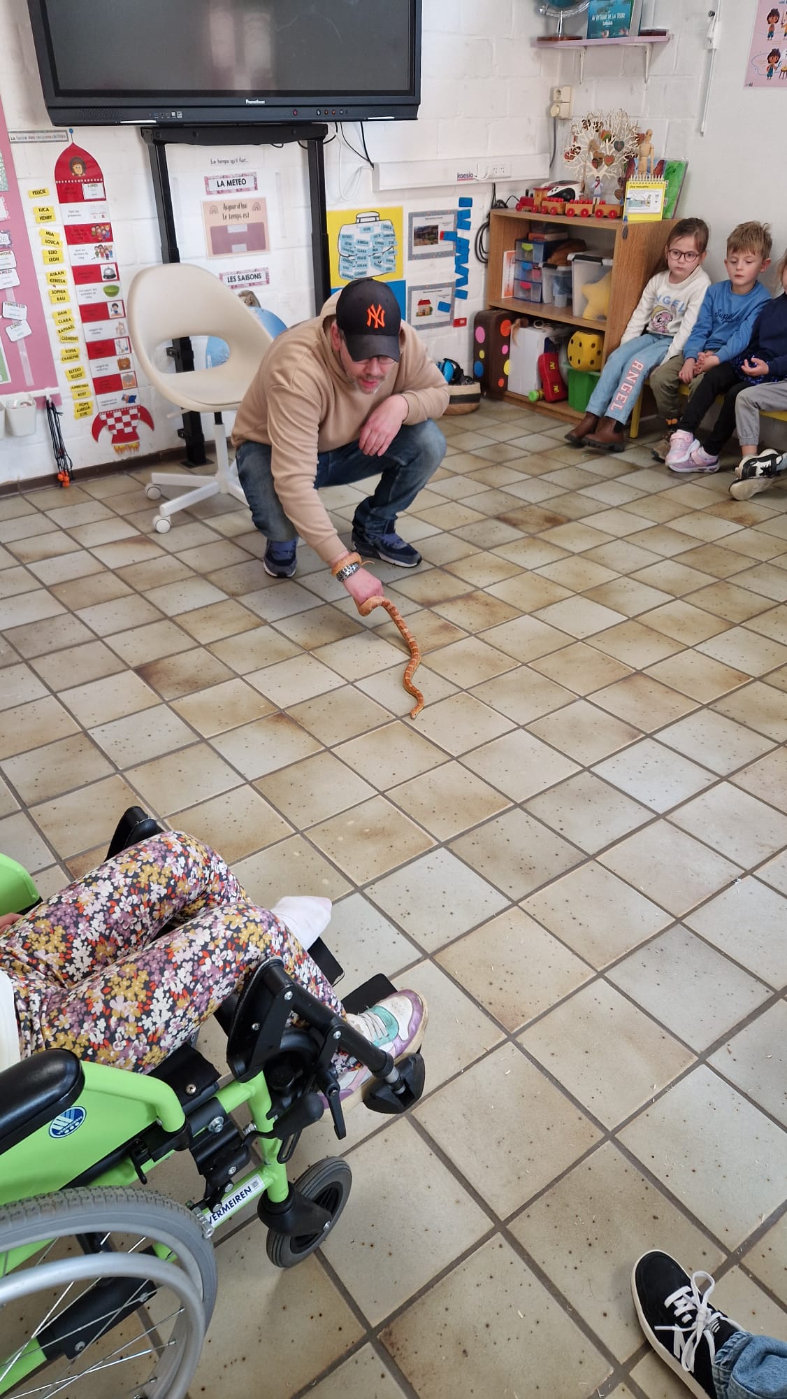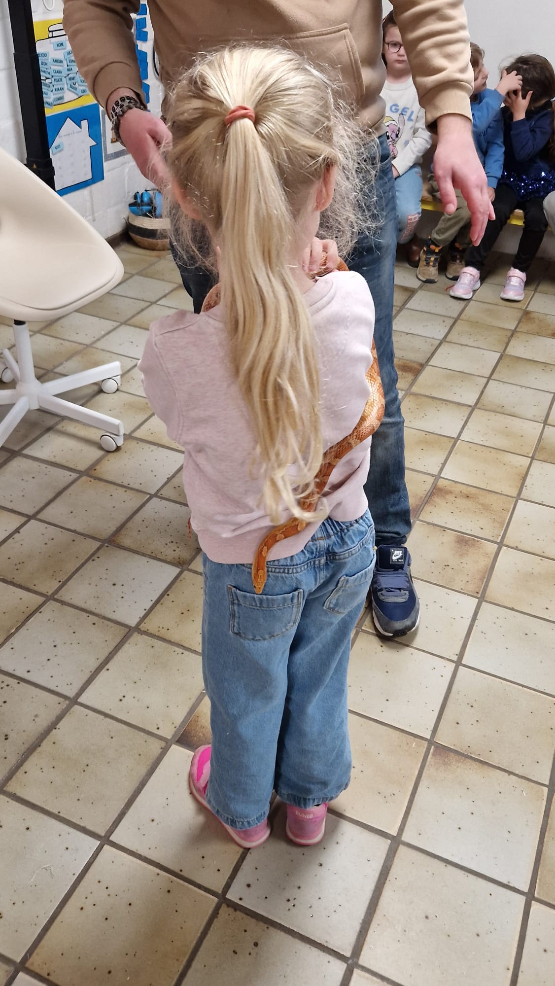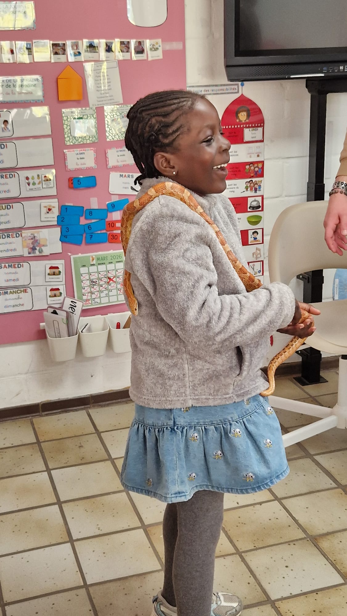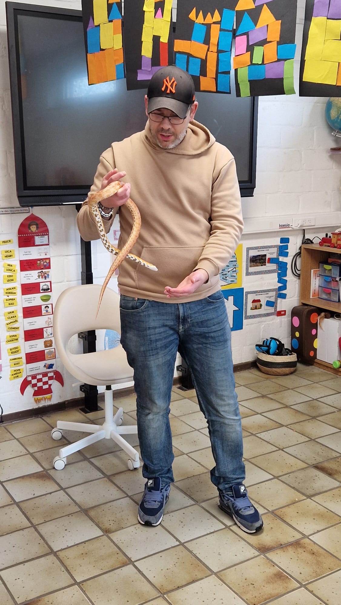Ce mercredi 25 mars, nous avons reçu la visite de Ginou, le serpent de Kerissa. Son papa Damien nous a permis de découvrir cet animal extraordinaire et surtout de surmonter la peur des enfants. Les plus téméraires ont même pu le porter et le toucher. Quelle belle découverte en éveil scientifique