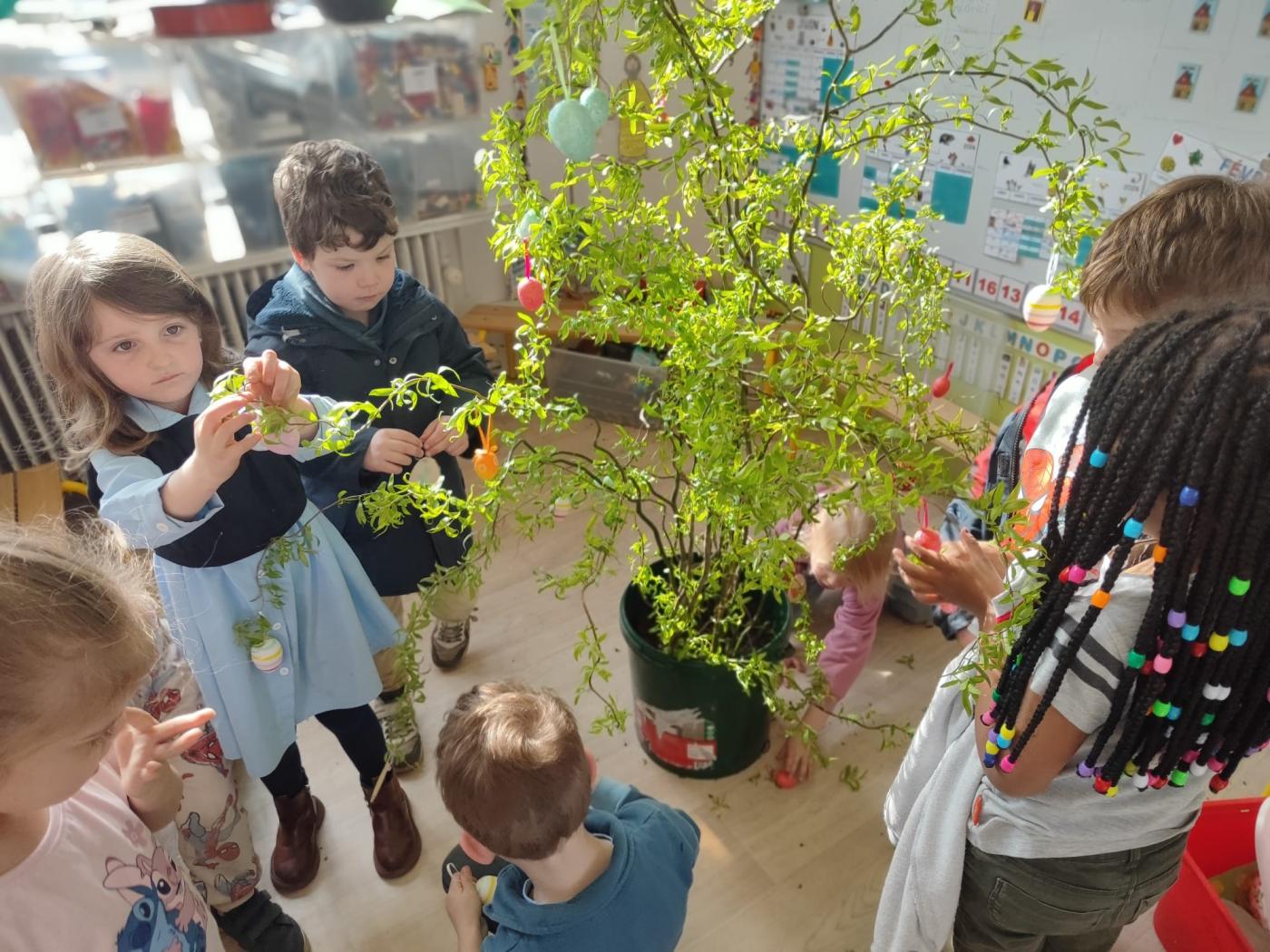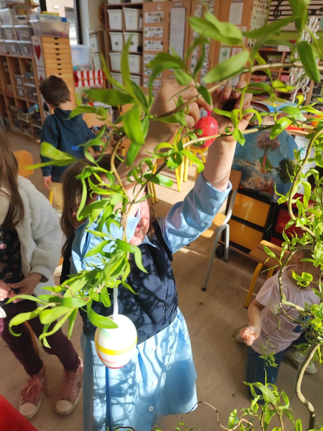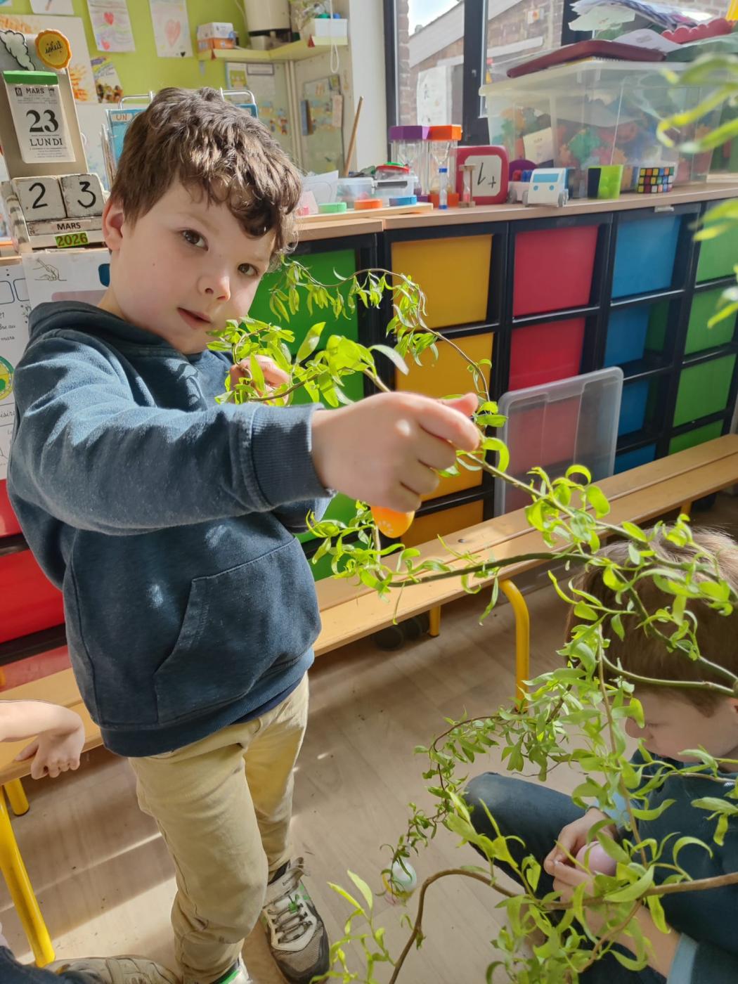 Classe de Mme Anne. Nous avons observé les signes du Printemps, la flore et la faune qui se réveillent après l'hiver. Nous en avons profité pour ramener des branches pour préparer notre arbre de Pâques.