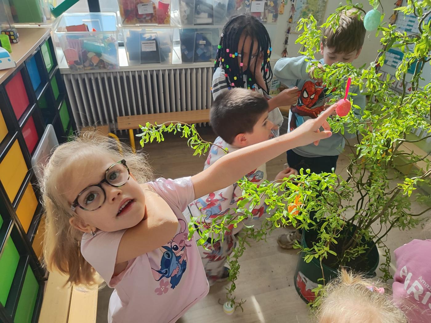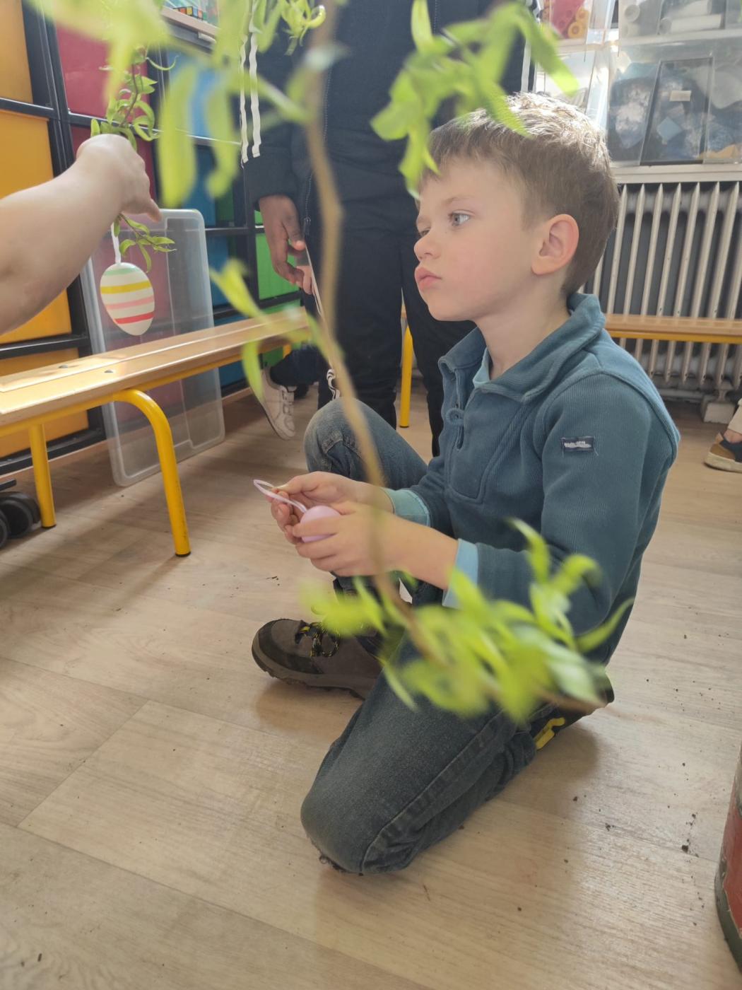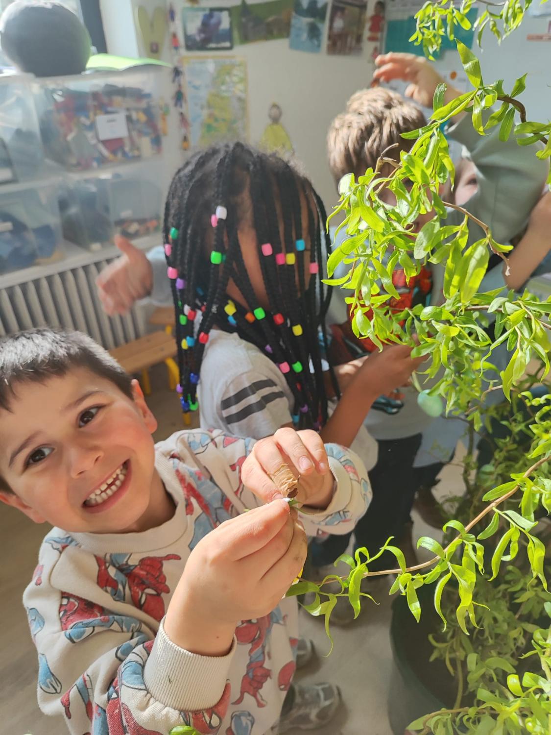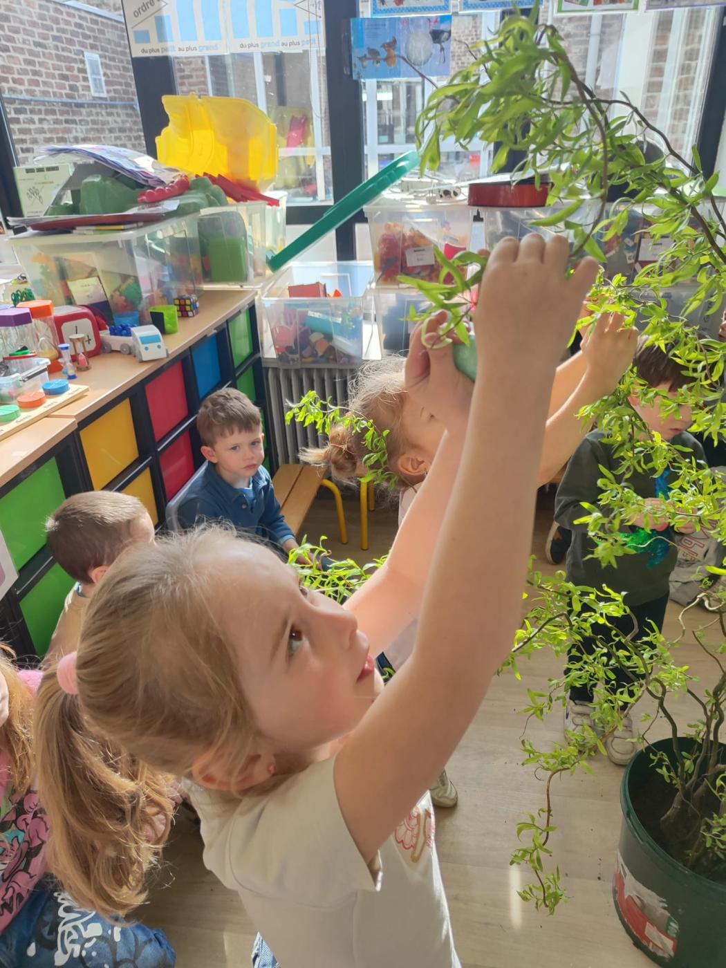 Classe de Mme Anne. Nous avons observé les signes du Printemps, la flore et la faune qui se réveillent après l'hiver. Nous en avons profité pour ramener des branches pour préparer notre arbre de Pâques.